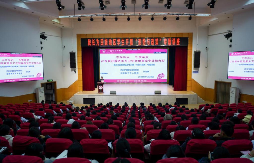 为加强形势与政策教育,提升民族地区学生对国家形势与政策的理解水平,助力民族地区人才培养,11月28日,学院院长张先庚教授在成都校区以线上线下相结合方式为两校区1000余名民族地区学生开展了以《志存高远 扎根基层 让青春在服务家乡卫生健康事业中绽放光彩》为主题的“形势与政策”专题讲座。
