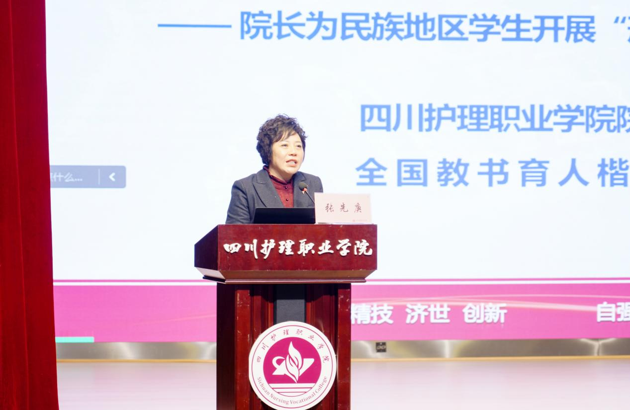 讲座中,张先庚结合党的二十届三中全会、省委十二届六次全会、全国教育大会、四川省教育大会及四川省卫生健康大会精神和国家、省卫生健康相关政策以及医药卫生专业和学生情况,围绕加快发展新质生产力,深化医药卫生体制改革,推进卫生健康现代化和卫生健康事业高质量发展,用翔实的数据和案例,从四川民族地区医疗卫生事业现状、学院对民族地区的对口帮扶、医药卫生事业未来发展趋势及新时代大学生责任担当四个方面,让同学们深刻感受到了党和国家对他们的关心关爱,帮助学生明确了努力方向,坚定了学习医药卫生专业的自信。她勉励同学们要珍惜在校学习机会,成为“感恩—奋斗—担当”的新时代大学生,爱党、爱国、爱校、爱家、爱专业,学好知识,练好本领,扎根基层,回到家乡、服务家乡、建设家乡,成为“情怀深、技术精、善创新、有大爱 讲奉献”的医药卫生人才,助推健康中国、健康四川战略。