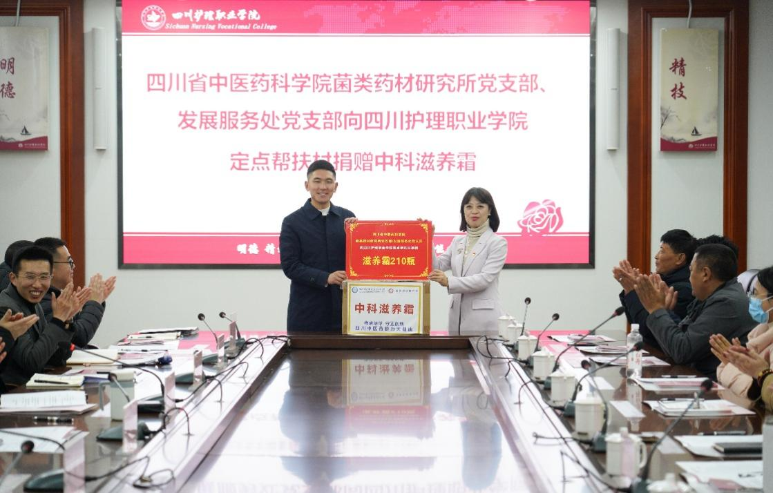 会上,四川省中医药科学院菌类药材研究所所长罗霞教授代表菌类药材研究所党支部、发展服务处党支部向学院定点帮扶村捐赠中科滋养霜,若尔盖县铁布镇党委副书记扎西当州代表帮扶村接受捐赠并表达了感谢。