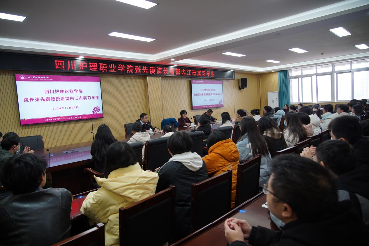 为深入贯彻落实全省教育大会精神和全省卫生健康大会精神,提高临床实习质量,促进学生就业,12月20日,学院院长张先庚教授带队看望学院在内江市三所医院实习的55名学生,并在内江市第二人民医院会议室召开实习生座谈会。