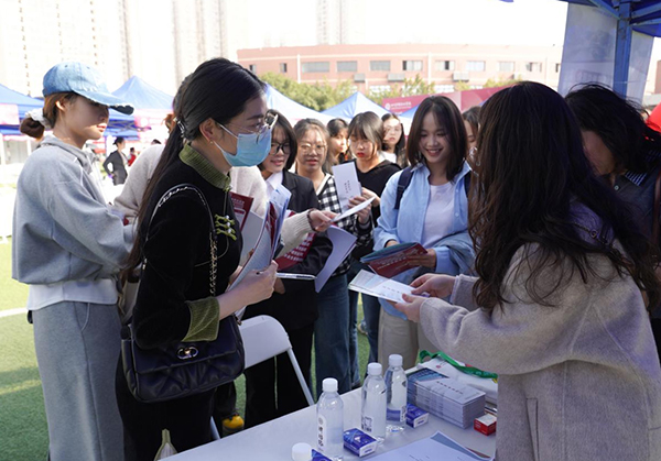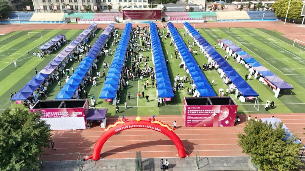 3月27日,学院操场上人头攒动,由成渝双城经济圈高校就业创业联盟医卫健康分盟、龙泉驿区人社局与学院联合主办的医药卫生类双选会正在这里如火如荼进行。现场既有传统医疗卫生机构的招聘专区,也有AI面试指导服务站、“三支一扶”“西部计划志愿者”、征兵入伍等政策咨询台,还有展示服务区——各系部的学生展示专业技能,服务用人单位和毕业生。现场,150余家用人单位架起展台,1600余个岗位虚位以待,3000余名毕业生怀揣职业梦想穿梭其间。