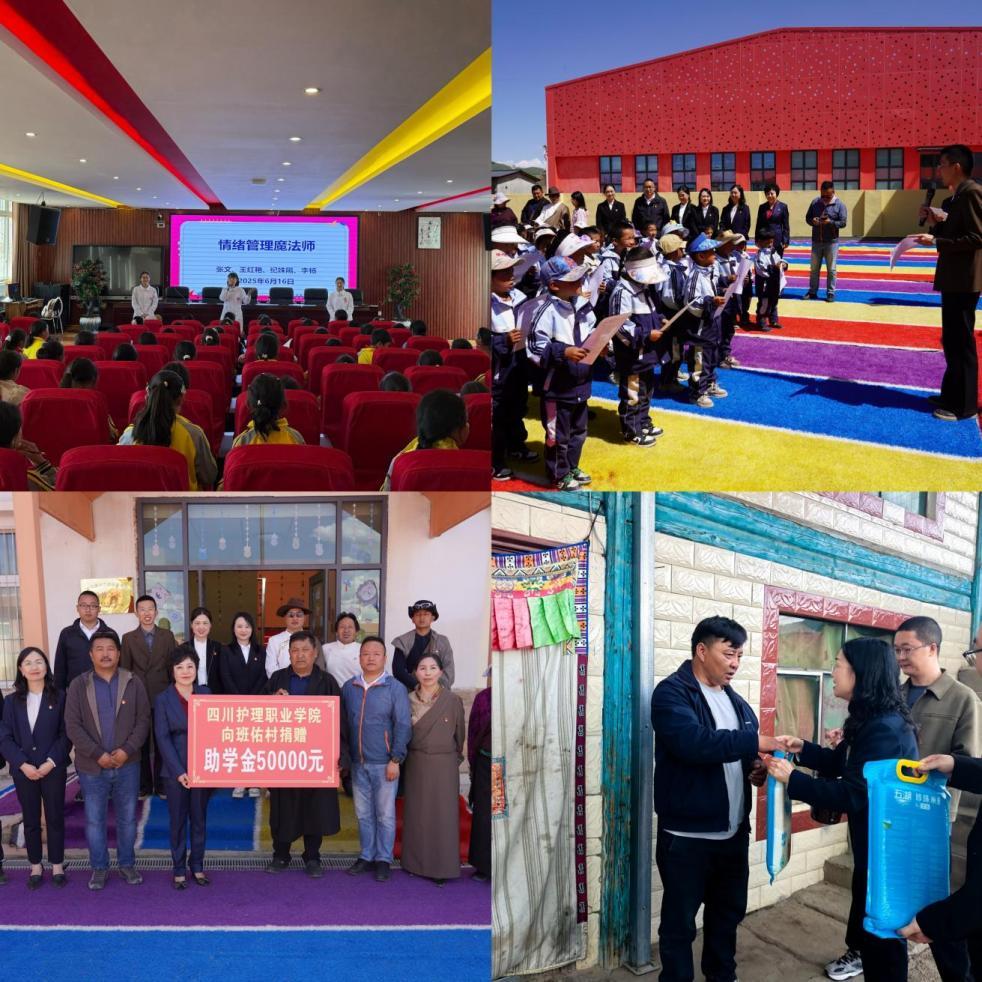 心灵赋能浸润校园。在若尔盖县城关第二小学校,学院健康科普团队为600余名学生开展心理健康讲座,普及情绪管理知识;在班佑村幼儿园,工作组开展“经典润乡土活动”,向班佑村捐赠助学金5万元,组织儿童诵读《我的祖国》,厚植家国情怀。