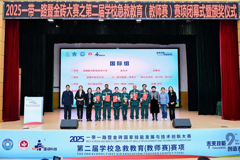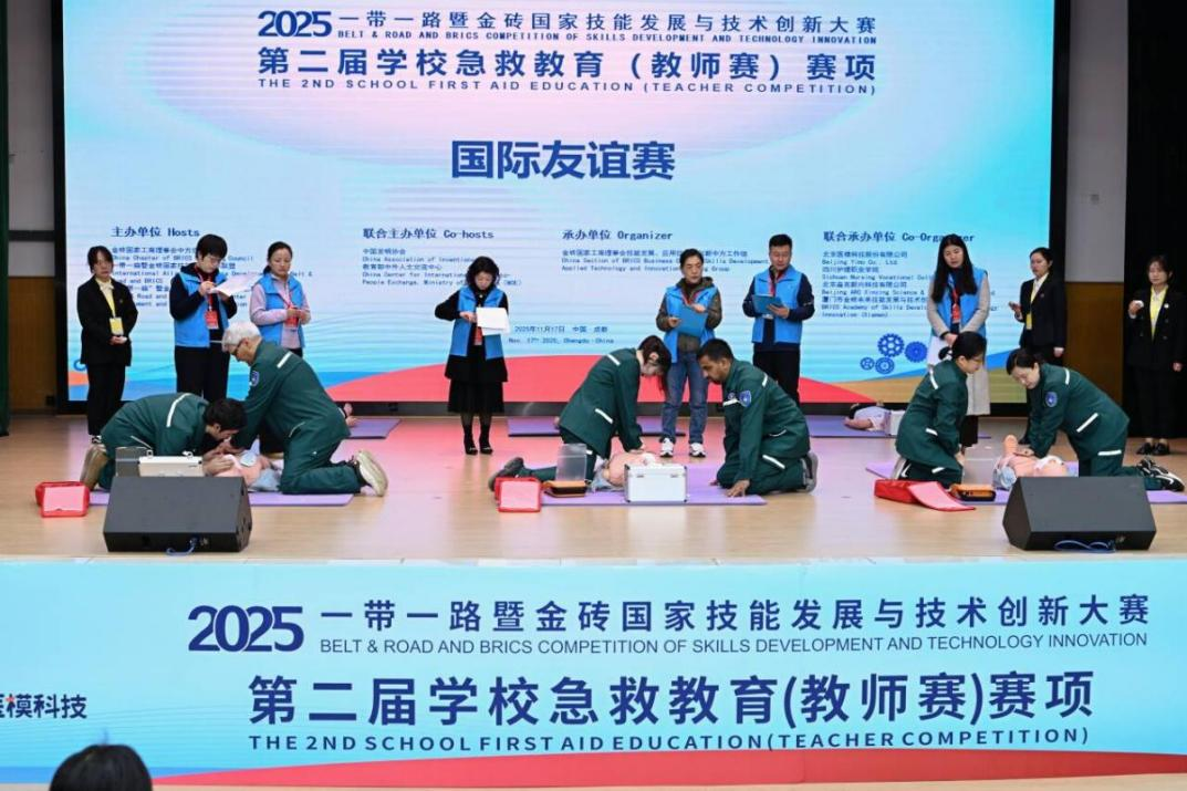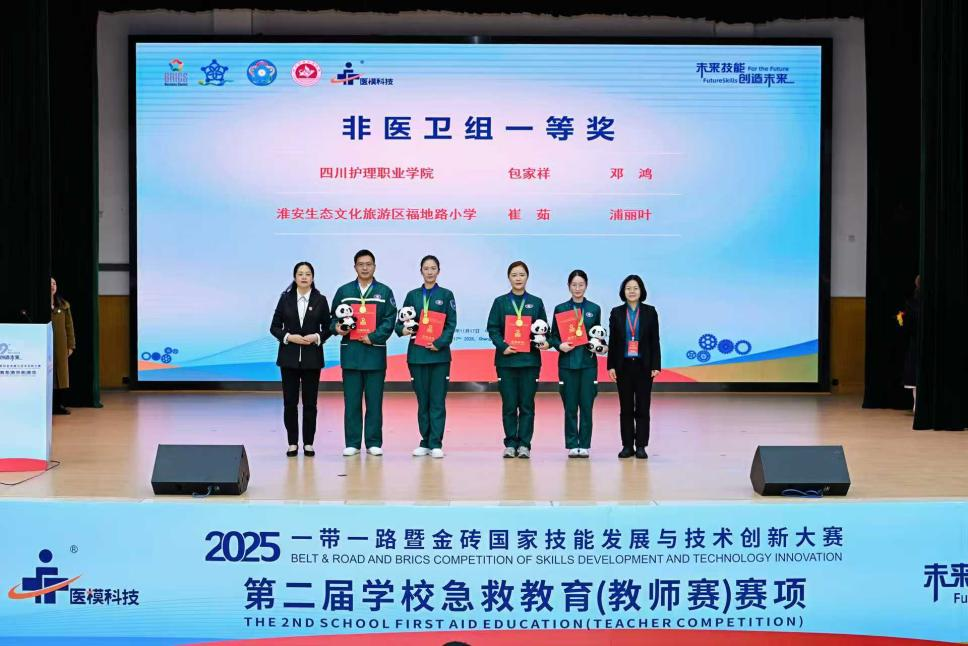 11月15日至17日,2025“一带一路”暨金砖国家技能发展与技术创新大赛第二届学校急救教育(教师赛)在76net必赢线路检测中心成都校区成功举办。本次赛事由金砖国家工商理事会中方理事会、“一带一路”暨金砖国家技能发展国际联盟、“一带一路”暨金砖国家技能发展与技术创新培训中心主办,76net必赢线路检测中心联合承办,于17日上午圆满闭幕。我校智慧护理学院教师李英、刘洁荣获医卫组一等奖;基础学院教师邓鸿、包家祥荣获非医卫组一等奖;智慧护理学院教师曾学燕、赵翠霞荣获优秀指导教师奖;学校荣获最佳组织奖、突出贡献奖。