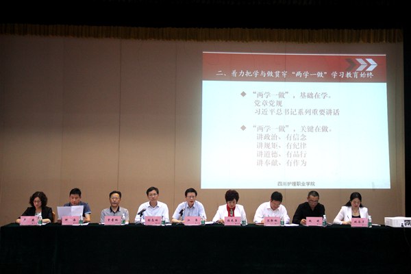 会上,学院院长张先庚同志传达了习近平总书记关于“两学一做”学习教育工作的重要指示和中央、省委“两学一做”学习教育工作座谈会精神。学院党委书记江涛同志就贯彻中央、省委、省教育工委和省卫生计生委的有关要求,结合学院实际情况,作了题为《真学实做严改 谱写学院创业攻坚发展新篇章》的动员部署讲话,从开展“两学一做”学习教育的重大意义、学做贯穿始终、解决突出问题、落实各项措施、推动学院创业发展、强化组织领导等7个方面全面安排部署了学院2016年“两学一做”学习教育工作,确保学习教育开好头,起好步。江书记希望学院广大党员能把学和做贯穿于“两学一做”学习教育的全过程,时刻用党章党规约束自己的行为,用习近平总书记系列重要讲话精神指导自己的行动,成为新时期一名优秀共产党员,在工作岗位上建功立业,为实现学院“2018年教育部办学合格评估达标、2020年省级示范高职院校达标、办学水平教育质量全面提升”、建设全国一流的高职院校目标,作出新的更大贡献!