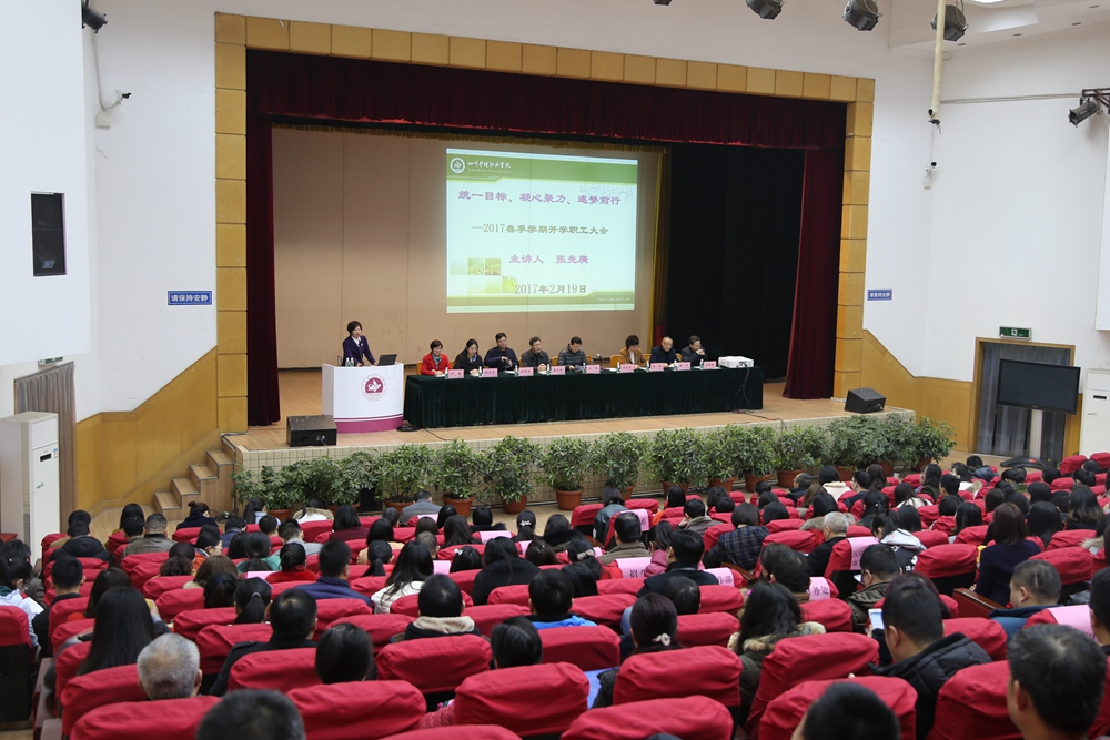 张先庚院长通报了假期行政工作并高度肯定了假期中坚守岗位的广大教职工所做的贡。张院长传达了全省教育工作会议精神;解读学院“十三五”发展规划和基本建设“十年发展规划”;并对新学期的理顺管理体制机制、基本建设、教学评估、招生就业等十大重点工作进行安排部署,要求全院上下统一思想,牢固树立“家校情怀”、“危机意识、机遇意识、发展意识”,积极主动作为,凝聚正能量,抵制负能量,围绕2018年评估达标中心工作全面推动学院各项工作。