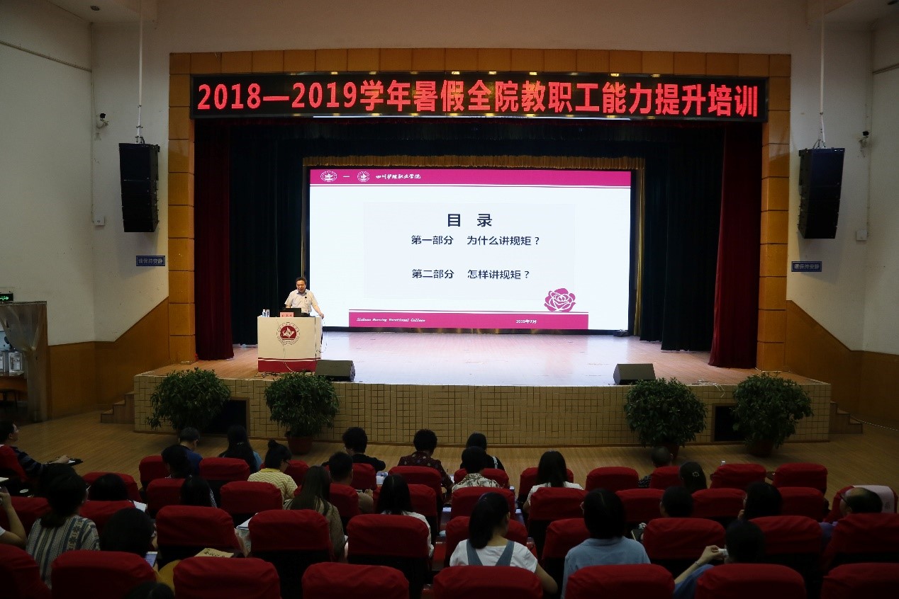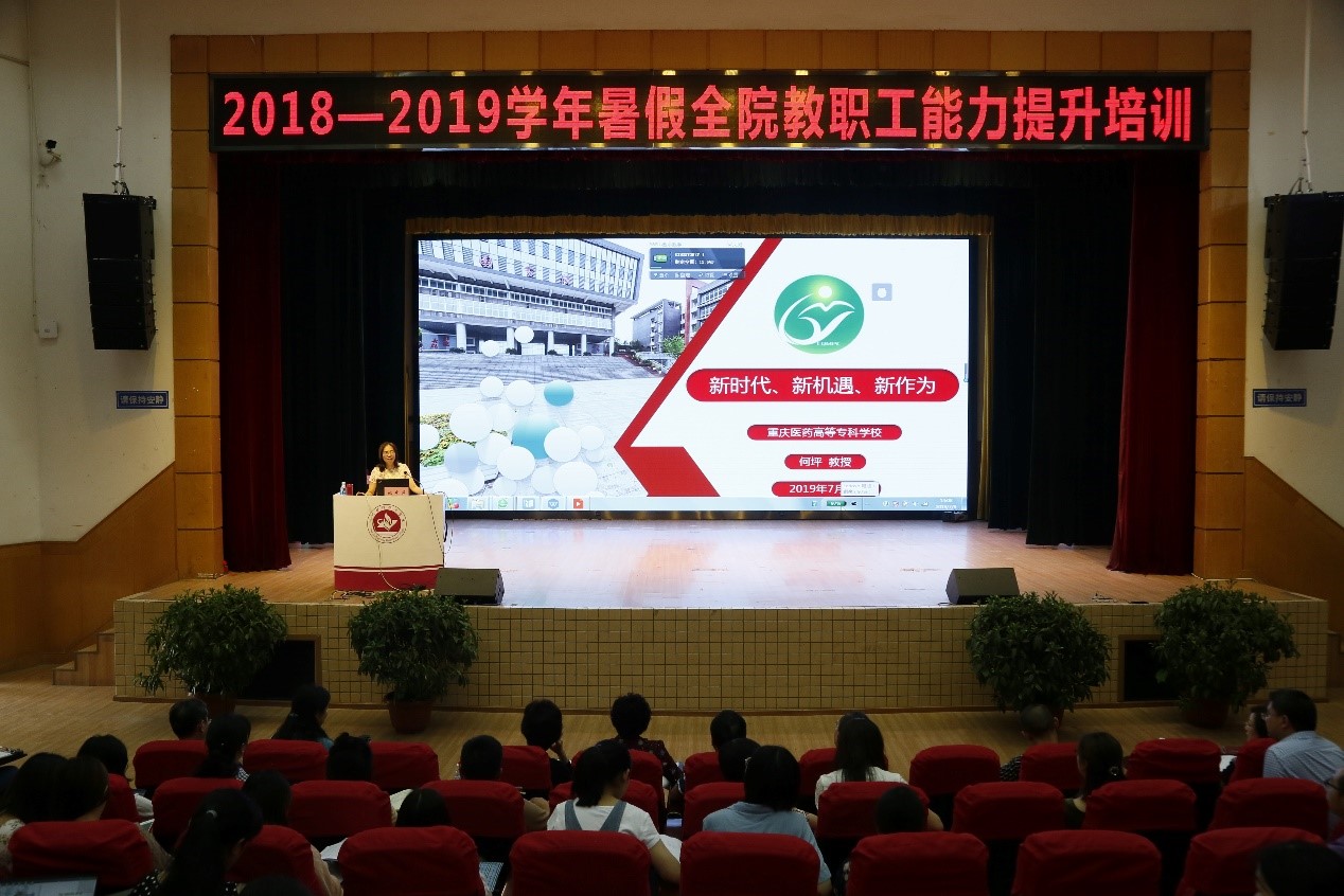 为深入开展“不忘初心、牢记使命”主题教育,贯彻落实《国家职业教育改革实施方案》文件精神,不断提升学院领导干部和教职员工的综合素质和能力水平,7月9日-10日,我院在成都校区学术报告厅组织开展了2019年暑期教职工能力提升培训会。学院党委副书记、院长张先庚教授、重庆医药高等专科学校副校长何坪教授、原成都中医药大学党委副书记张承远教授、南方医科大学国家级医学基础实验教学示范中心主任董为人教授等专家分别作了专题讲座。学院全体院校领导和教职员工共400余人参加了培训,培训会由学院姚永萍副院长主持。