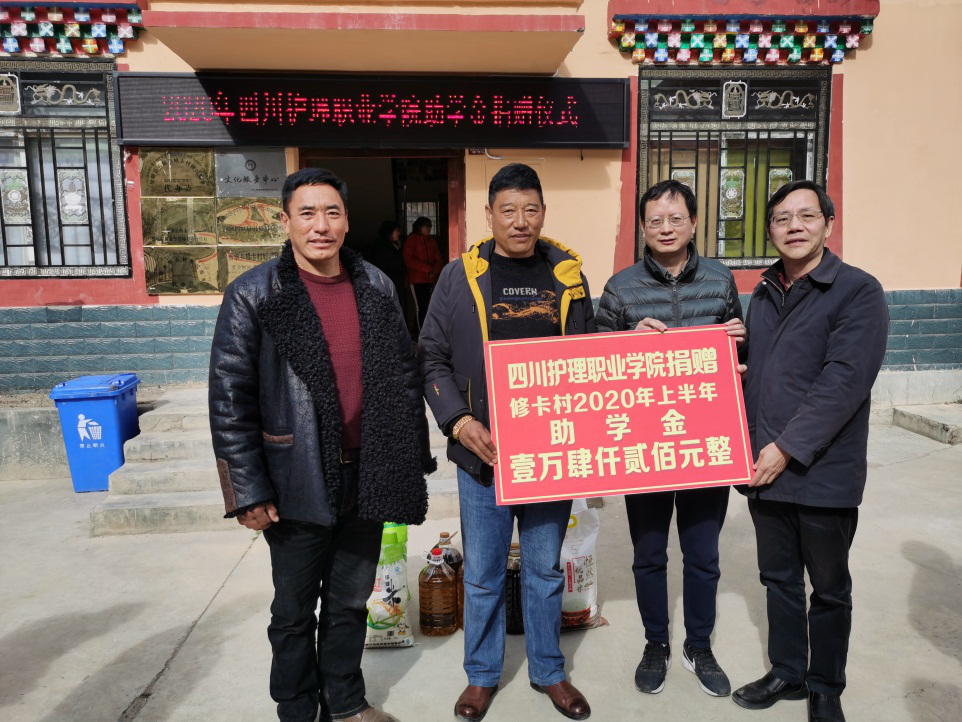 座谈会后,学院领导对驻村干部表示慰问,并向驻村干部赠送了米、油等慰问品。江涛书记、张志林副书记代表学院向修卡村捐赠了2020年上半年助学金1.42万元。