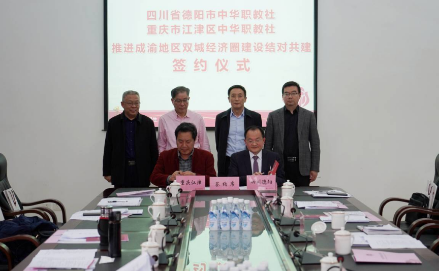 为贯彻落实习近平总书记关于推动成渝地区双城经济圈建设的决策部署,在两地开展中华职教社结对共建合作。在座谈会现场,四川省德阳中华职教社和重庆江津中华职教社代表签订了结对共建合作协议,共同推进成渝职业教育协同发展,助推双城经济圈建设。