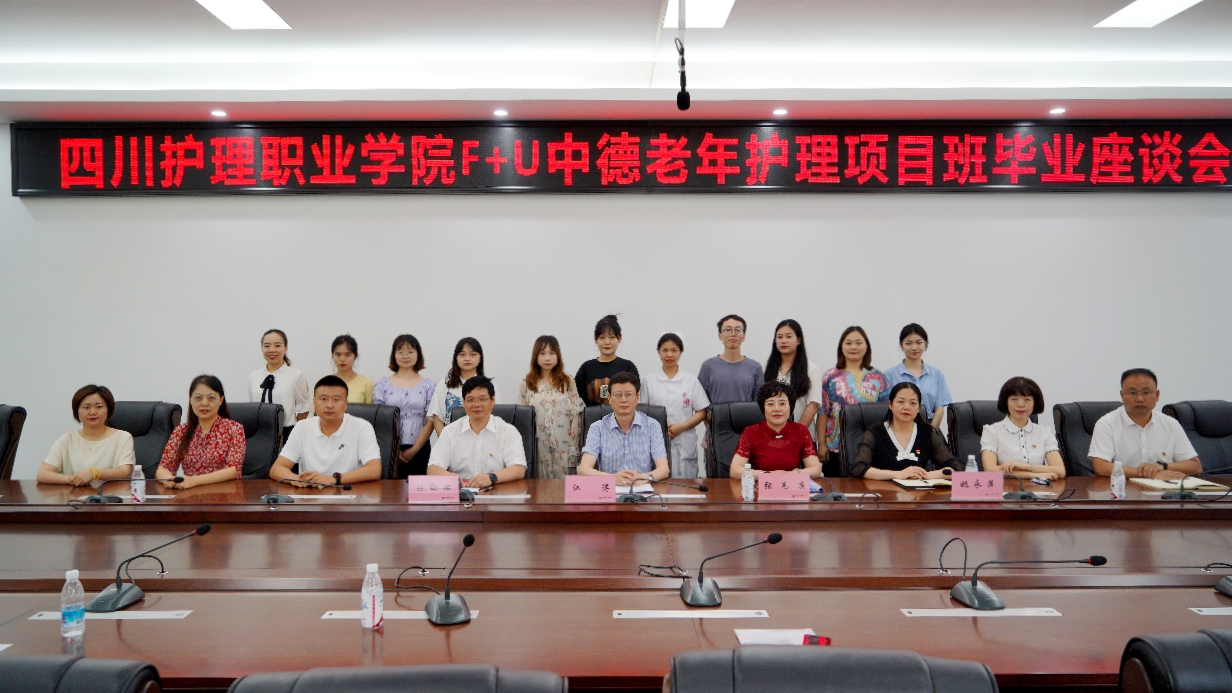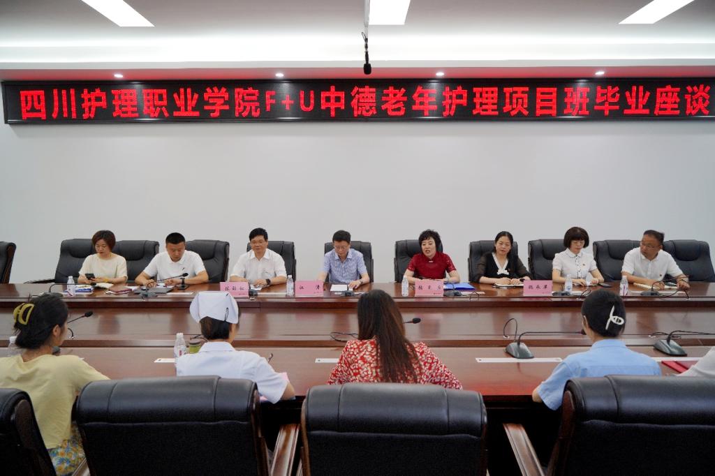 6月29日上午,76net必赢线路检测中心2018级德国萨克森州F+U中德老年护理班毕业生代表座谈会在龙泉校区隆重举行。学院党委书记江涛、院长张先庚、副院长陈劲松、姚永萍和护理系、学工部、培训中心等相关部门领导及教学团队代表参加了座谈。