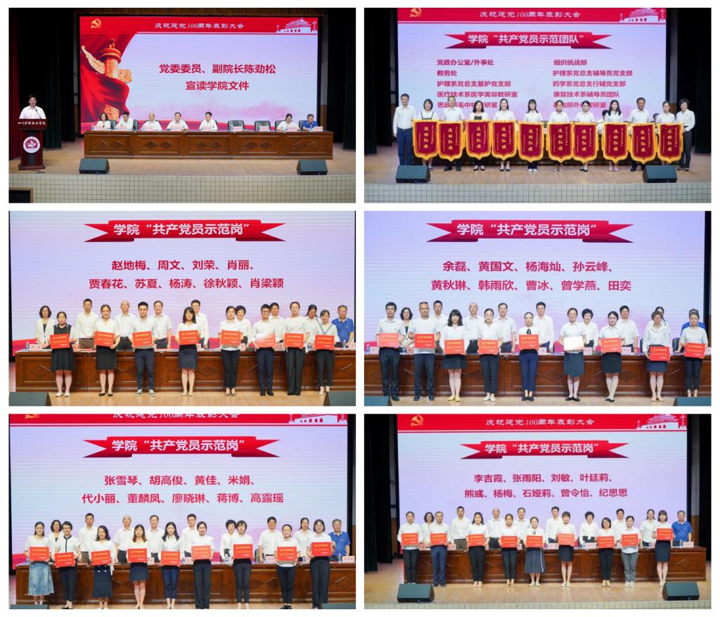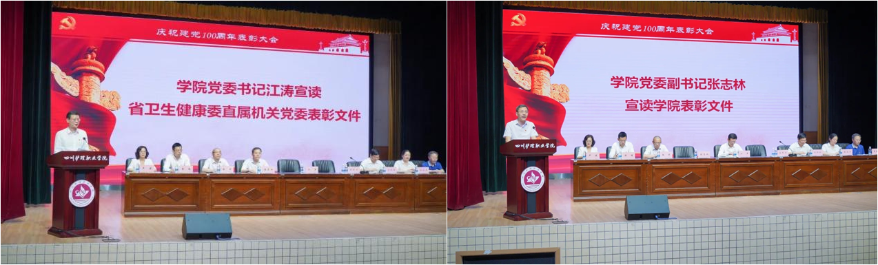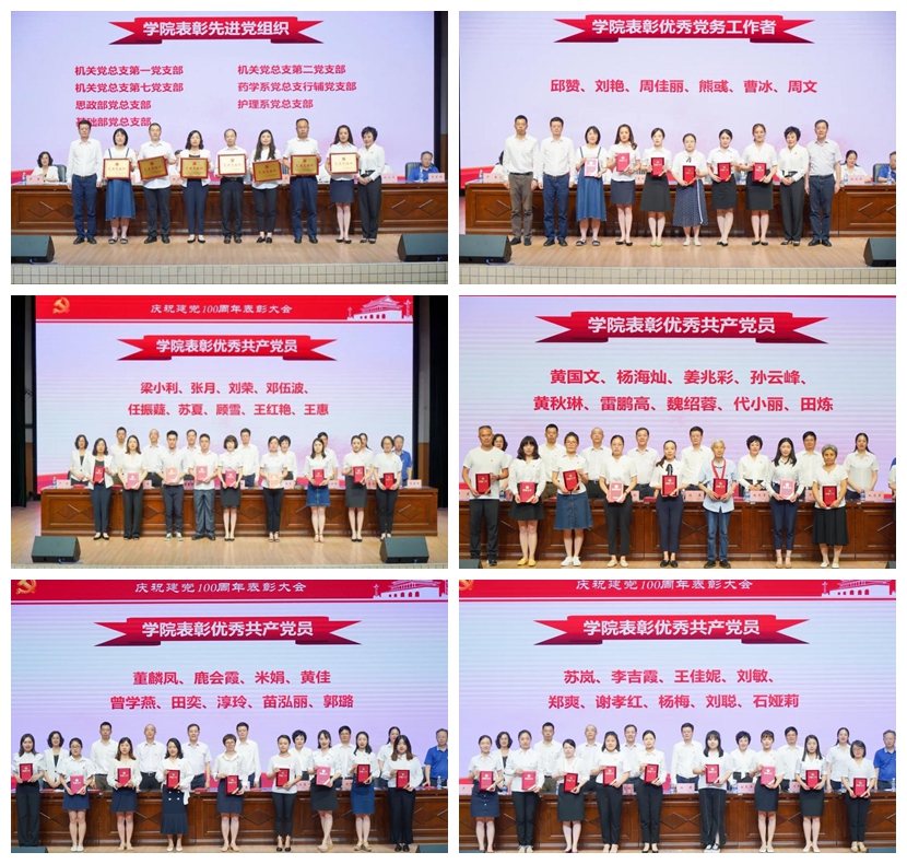 党委书记江涛、副书记张志林分别宣读省卫生健康委直属机关党委和学院“两优一先”表彰文件,出席大会的院领导为获得学院“两优一先”表彰的38名优秀共产党员、6名优秀党务工作者和7个先进基层党组织颁奖。