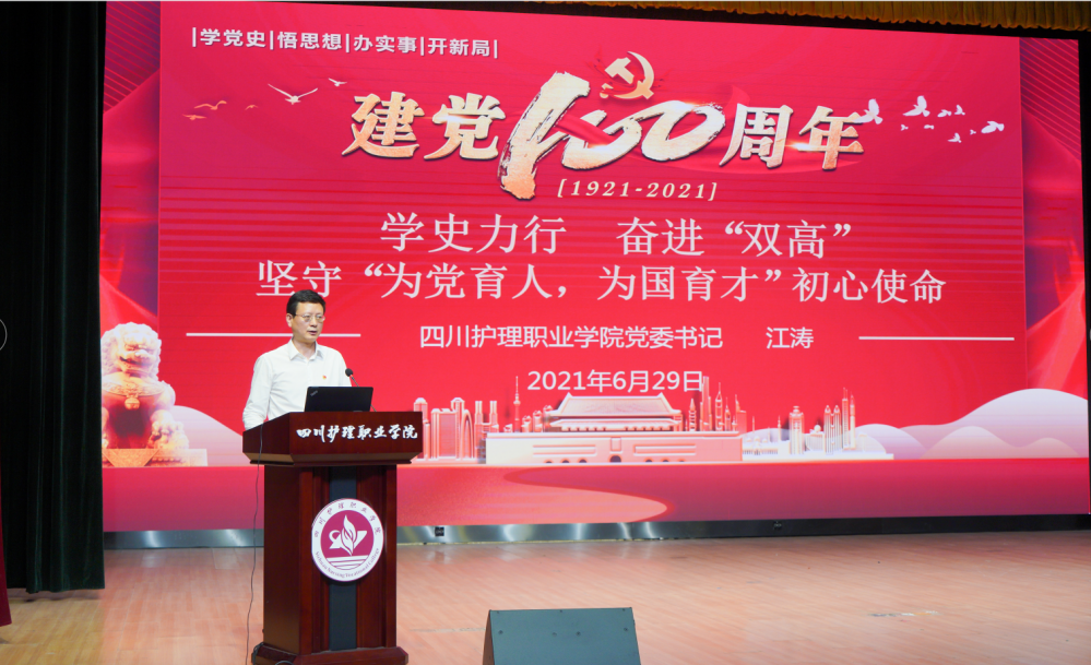 党委书记江涛作庆祝建党100周年主题报告暨专题党课,党课从“深刻认识党史学习教育重大意义和要求”“百年党史光辉历程和贡献”“中国共产党为什么能”“学史力行,奋进双高,坚守‘为党育人,为国育才’初心使命”四个方面进行系统阐述,并结合学院实际,提出在“加强党建、立德树人、高质量发展”上力行的三大工作思路,教育引导广大党员干部从党的百年历史中汲取智慧和力量,认真践行“为党育人,为国育才”初心使命,为健康中国、健康四川做出新的更大贡献,为实现中华民族伟大复兴而努力奋斗。