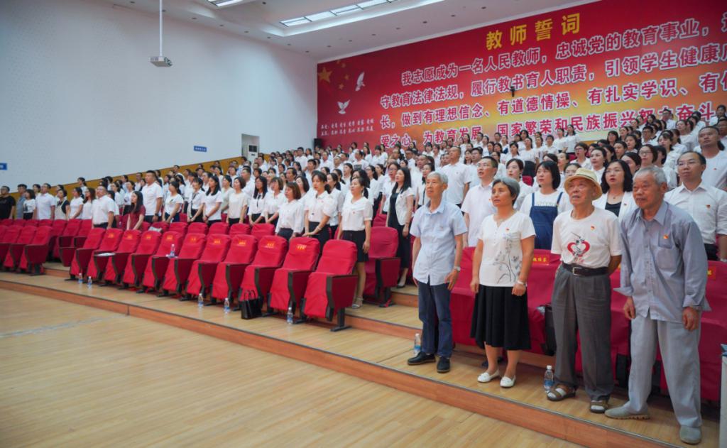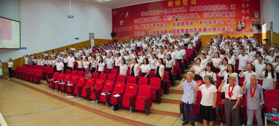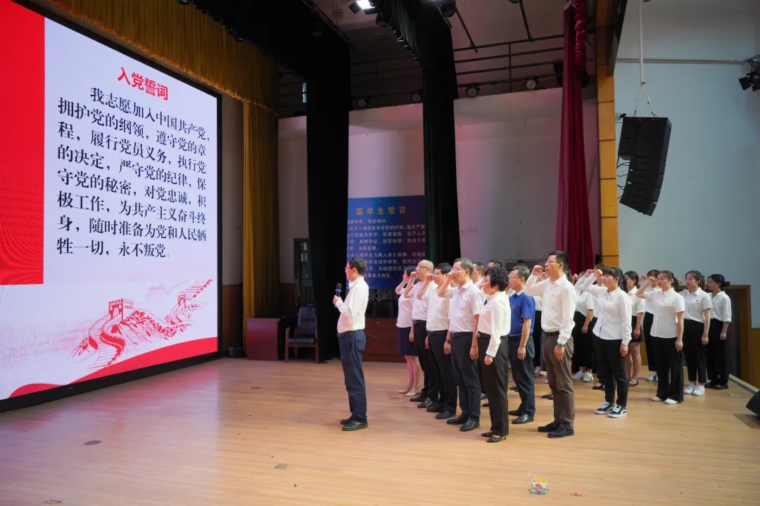 大会举行党员重温入党誓词暨新党员入党宣誓仪式。党委书记江涛带领到会的全体党员和新发展党员,面向党旗庄严宣誓。