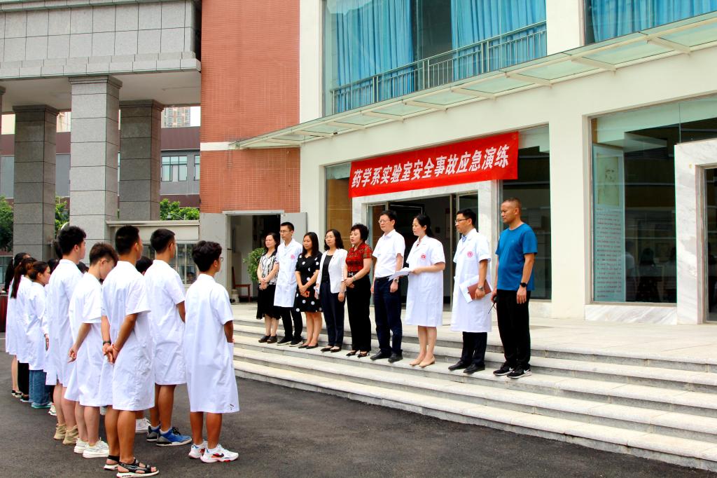 为进一步贯彻落实四川省安全生产委员会、省卫健委、省消防安全事件指挥部关于高校安全事故预防工作的相关文件精神,加强实验室安全教育,强化师生的实验室安全防护意识,增强师生应对实验室突发安全事故的应急处置能力,7月1日,学院组织开展成都校区新实训大楼药学实验中心应对实验室突发安全事故应急演练活动。学院党委书记江涛、院长张先庚全程督导,副院长姚永萍现场指挥,药学系、相关职能部门领导及系部师生代表共80余人参加。