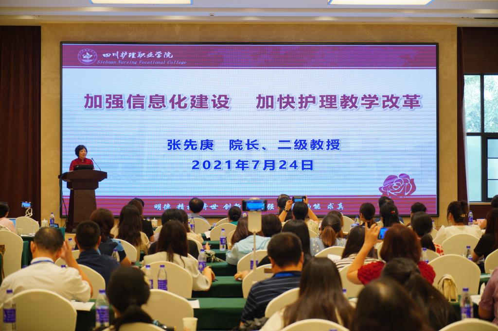 张先庚院长应邀作题为“加强信息化建设,加快护理教学改革”的大会报告。张院长从教育信息化政策背景,聚焦我院近年来信息化教学改革实践及成效、现状与未来展望四个方面阐释。强调信息化改革是推动新时代高职护理教育提质培优、增值赋能的关键,也是贯彻习近平总书记对职业教育“大有可为”转化为 “大有作为”重要抓手。报告受到与会代表的一致好评。