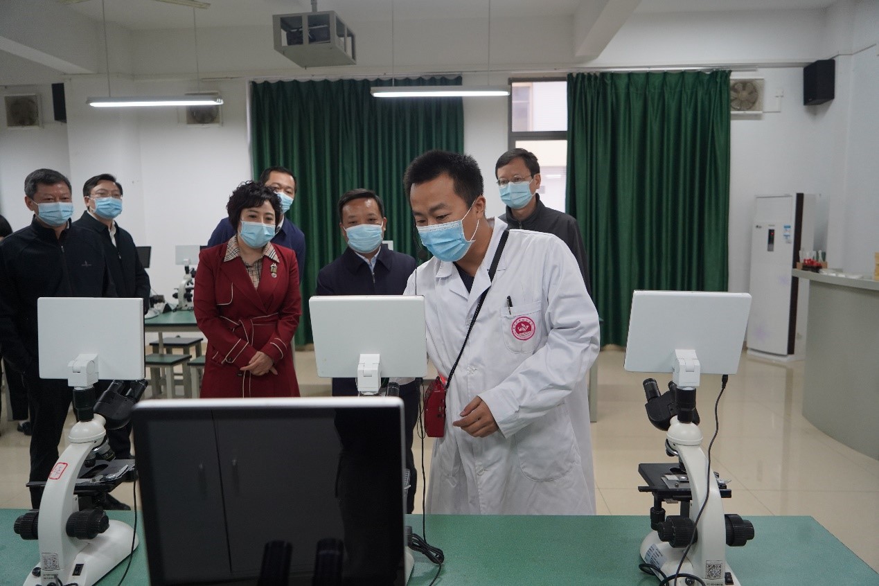 靳磊书记听取了学院总体发展规划和工作情况汇报,参观了健康技术技能馆、护理实训楼、生命历程馆、图书馆、实训中心等,详细了解学院专业设置、教学改革、师资队伍建设、实训实习、校企合作等情况,并就创新职业教育发展模式、深化产教融合校企合作等方面听取意见建议。