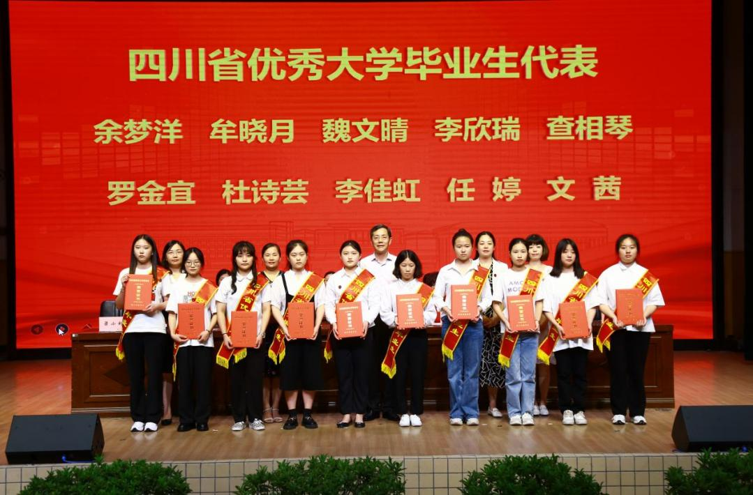 学院党委副书记张志林宣读了《关于表彰2022届四川省优秀大学毕业生的决定》和《关于表彰2020-2021学年国家奖学金获奖学生的决定》文件,10名省级优秀毕业生代表和10名获得国家奖学金的学生上台领奖,并合影留念。