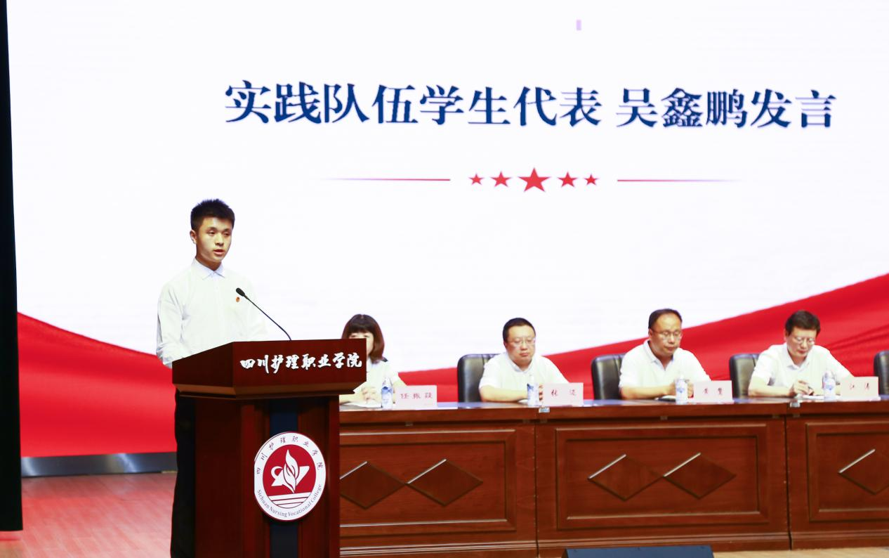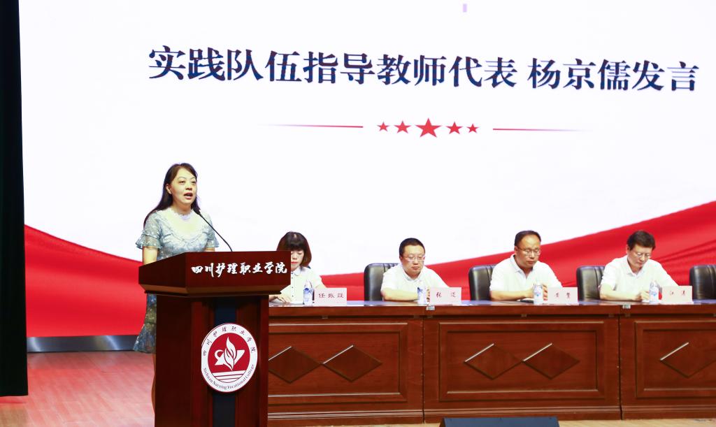 护理系实践队伍指导教师代表杨京儒在发言中谈到了开展“三下乡”社会实践的重要意义,分享了自己的实践感悟,鼓励同学们充分发挥自己的专业特长,把青春梦融入中国梦,在基层中点亮“求实创新”精神。