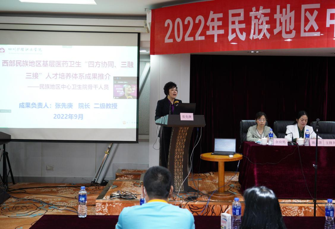 本次大会,张先庚院长作主题为“西部民族地区基础医药卫生‘四方协同、三融三接’人才培养体系成果推介”的讲座并讲话,她以“基层医药卫生人才培养理念和目标”为主线,明确指出要树立“面向基层、服务需求”理念,强化“民族情怀、奉献精神、全科才能、创新精神”,培养“情怀深、技能精、能力强、下得去、留得住、干得好”的民族地区基层卫生技术技能人才,并从教学问题、解决教学问题的办法、创新点、推广应用效果四个方面做了深入分析交流。会议还特邀中国工程院院士刘德培、国家人口健康科学数据中心尹岭教授在北京参加了线上会议,他们对四川民族地区医疗项目的开展给予了肯定,并对下一步发展规划提出了宝贵的建议。