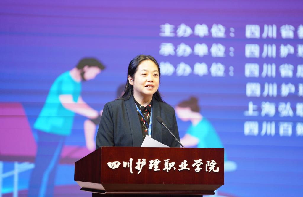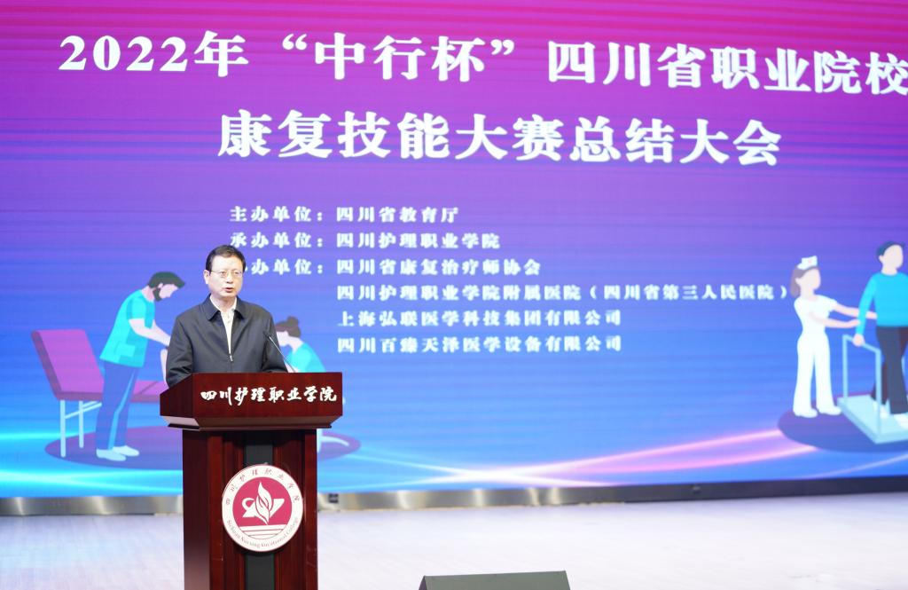 在大赛总结会上,学院党委书记江涛致辞。他指出,学院承办此次大赛,既是上级部门与兄弟院校的信任与厚爱,更是学院全面贯彻落实党的二十大关于强化人才支撑、推动职业教育高质量发展决策部署的重要举措。本次大赛为各参赛队伍、院校间搭建了技能分享、能力展示和增进交流的平台,充分展现各参赛选手的职业技能与精神风貌,达到了“以赛促教”“以赛促学”“以赛促练”的目的,是我省康复专业职业教育教学能力水平的集中体现。他向各兄弟院校介绍了学校近年来的跨越发展,并表示将进一步加强相互间交流合作,实现互利共赢、共同发展,共同助推职业教育高质量发展,为健康中国、健康四川做出应有的贡献,为实现“第二个百年奋斗目标”和中华民族伟大复兴中国梦贡献智慧与力量!