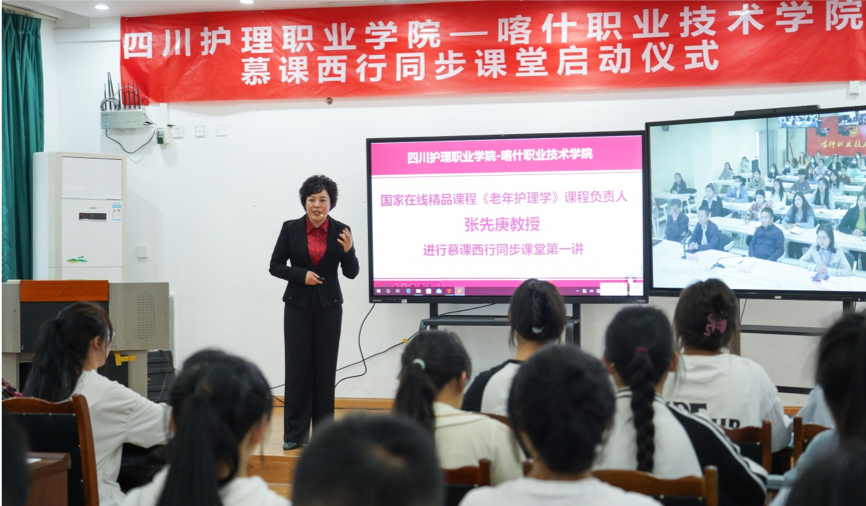 本次同步课堂由全国教书育人楷模、国家级在线精品课程《老年护理学》负责人张先庚教授主讲。在云端课堂上,张先庚以任务为导向,以人口老龄化现状与趋势、养老政策、老年护理特点及工作要求为主线,结合真实案例和学院在老年护理人才培养方面的改革实践,融入思政元素,精心设计了多个互动环节,应用智慧化教学手段,使两校学生充分融入课堂,教学内容丰富,深入浅出,课堂气氛活跃,让同学们在云端课堂亲历一场不一样的精彩。本次同步课堂得到了喀什职业技术学院师生的积极反馈,他们表示同步课堂内容精彩,重点突出,巧妙地融入思政元素,加强了职业素养教育,获益匪浅。本次课堂是喀什职院教学创新的又一课,打破了学院围墙的限制,通过张院长的精彩课堂,使她们增长了知识,开拓了眼界,这样的同步课堂优质、高效、充满新知识、新信息、新技术,渴望今后能有更多的交流与互动。