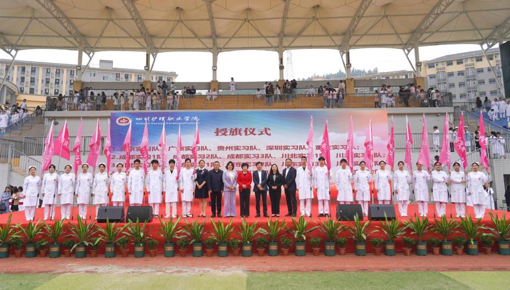 张先庚院长致辞,她向即将参加临床实习的全体护理学子致以美好的祝愿,并提出三点期望与全体学子共勉:一是要胸怀“国之大者”,坚定不移听党话、跟党走,怀抱梦想又脚踏实地,敢想敢为又善作善成,立大志、明大德、成大才、担大任,努力成为堪当民族复兴重任的德智体美劳全面发展的高素质护理技能人才;二是要谨记南丁格尔誓言,敬佑生命、救死扶伤、无私奉献、大爱无疆,学好知识与技术,到祖国最需要的地方建功立业,为健康四川、健康中国贡献力量;三是要弘扬川护精神,传承川护大爱,做有理想、敢担当、能吃苦、肯奋斗的新时代白衣天使,让青春在全面建设社会主义现代化国家的火热实践中绽放绚丽之花!