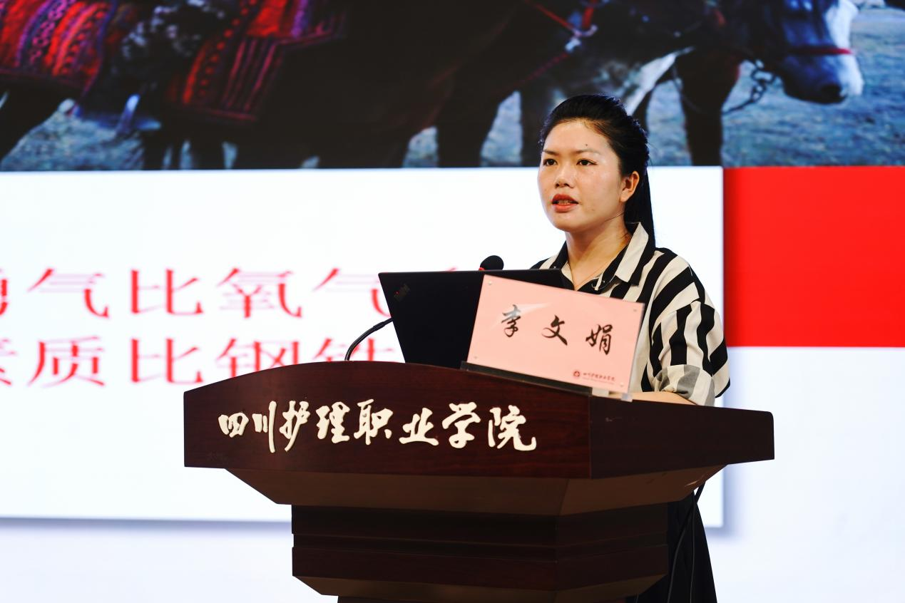 李文娟以“青春向党  不负人民”为主题,从“不忘初心、砥砺奋进”、“脚踏实地、行稳致远”、“前程似锦、未来可期”三个方面,声情并茂地分享了她作为护理专业学生,立志勤奋学习,逐步树立大爱无疆、报效祖国理念的学习历程。重点讲述了自己毕业后积极响应党和国家号召,自愿扎根新疆、服务新疆的成长奋进之路。她深情讲述了8年来,她坚定理想信念,用实际行动践行家国情怀的心路历程。作为四川本土成长毕业的护理学子成长为新疆克州阿克陶县布伦口乡党委书记和新疆克州商务局副局长,她克服了常人难以想象的语言、气候、环境、交通、工作、生活等带来的不适与挑战,带领乡亲们常年坚守祖国边疆——新疆克州阿克陶县布伦口乡等4个乡镇,在帕米尔高原上攻坚克难、砥砺奋进、励精图治、勇毅前行,攻克了一个又一个难题,取得了一项又一项突破,实现了一个又一个奋斗目标,新疆克州阿克陶县布伦口乡快速发展变化,她代表乡亲们曾三次受到习近平总书记亲切接见。她表示,将继续在以习近平同志为核心的党中央领导下,坚守初心,牢记使命,进一步践行感恩、奋进、大爱无疆的精神,一辈子守护新疆、奉献新疆。