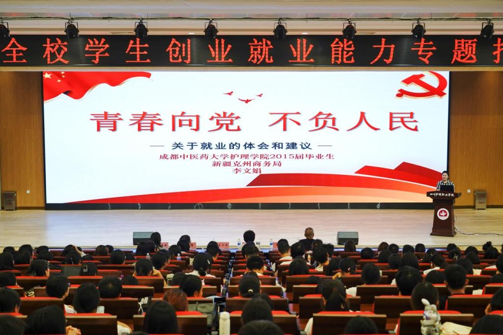 同时,她讲述了大学期间,时任成都中医药大学护理学院院长的张先庚教授及其团队对她的大爱教导,对她人生的选择影响深远,使她一生受益。她用扎根边疆的高校毕业生、守边护边的“全国最美奋斗者”的故事,勉励同学们在生逢盛世的新时代,要抢抓职业教育发展大好机遇,在大爱温馨的“川护”校园里,扎实学好知识技能,树立到基层就业观念,积极到农村去、到西部去、到新疆去,让青春在全面建设社会主义现代化国家的火热实践中绽放绚丽之花。