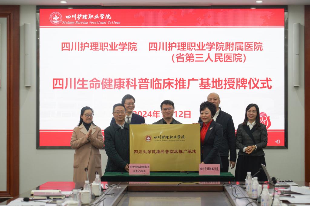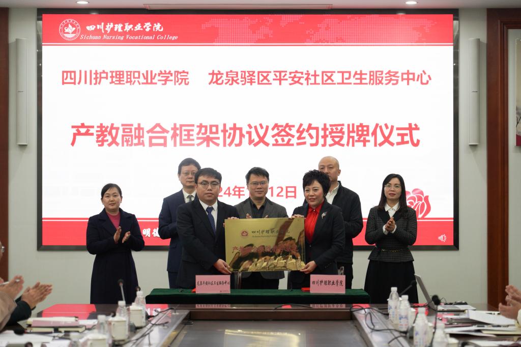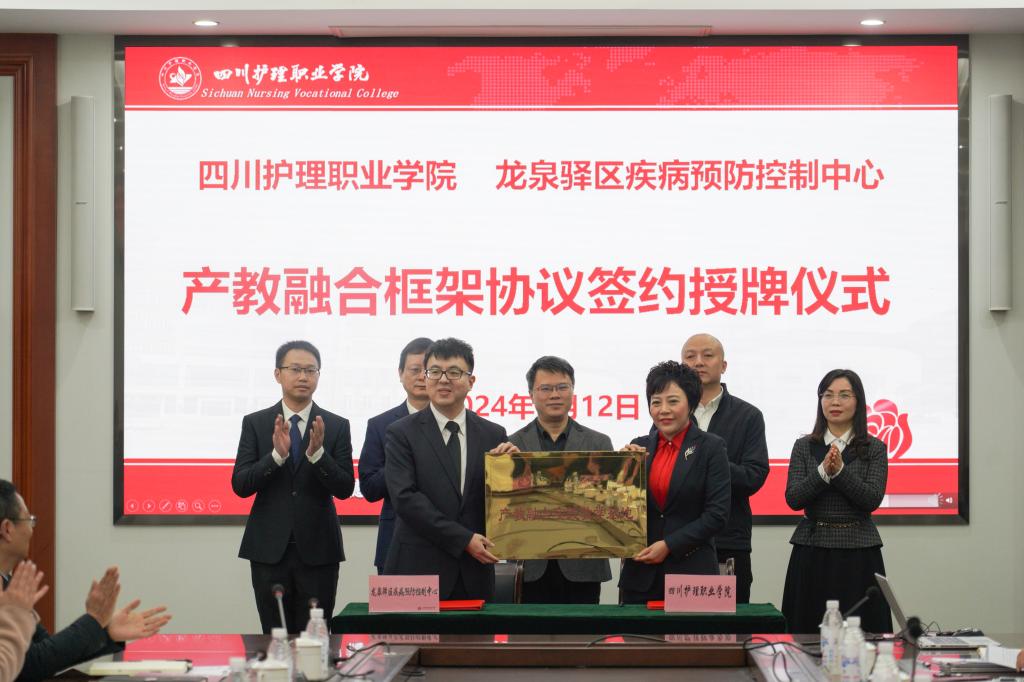 产教融合签约授牌环节,学院院长张先庚分别与龙泉驿区第一人民医院、龙泉驿区疾病预防控制中心、龙泉平安卫生服务中心签约并授牌,为学院附属医院(省第三人民医院)健康科普基地授牌。