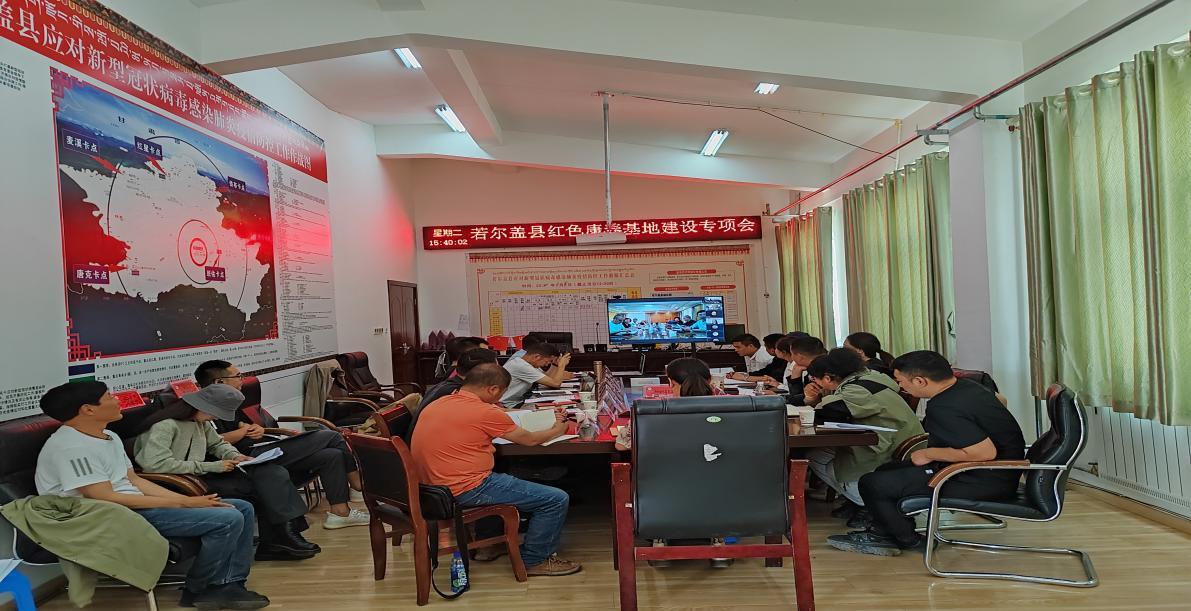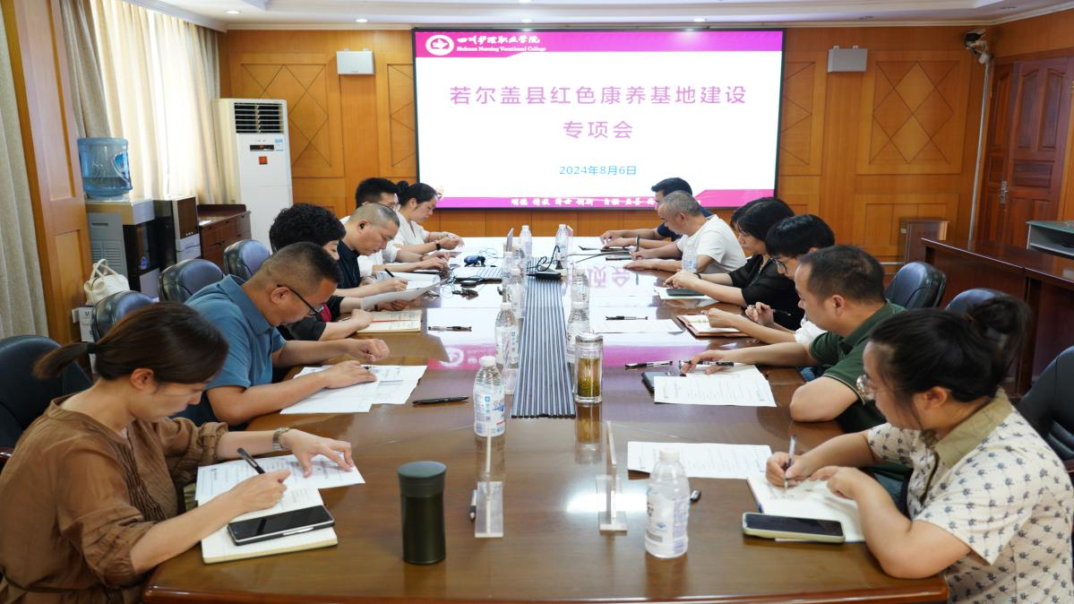 学院派驻若尔盖县康养专家包锐全面介绍了当前红色康养基地建设情况、下一步工作计划和学院派驻的6名驻村干部分片区负责红色康养基地情况;学院志愿者办公室主任、学生工作部副部长申洋,介绍了红色康养基地建设组织架构和职责分工。