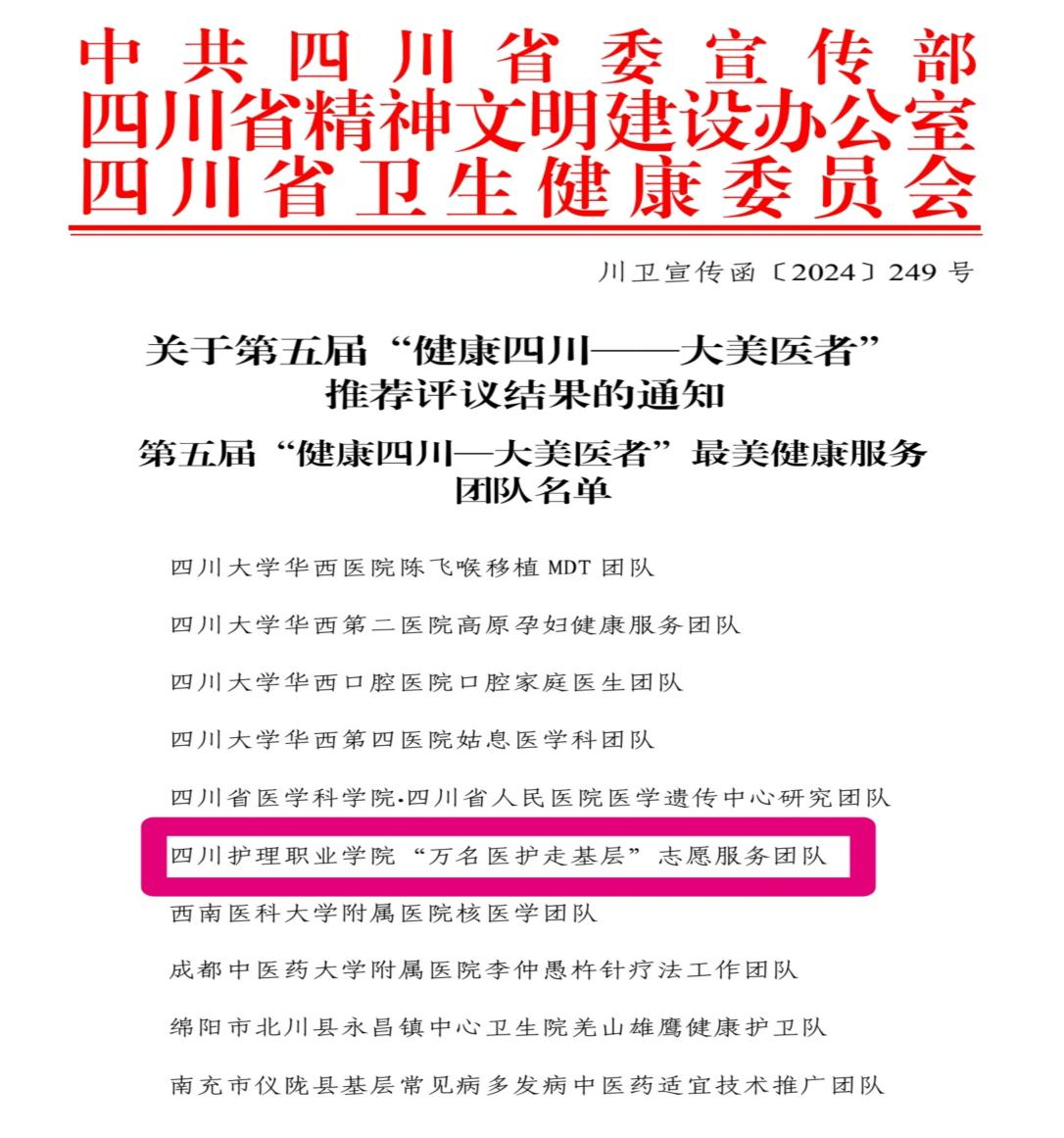 学院“万名医护走基层”志愿服务团队成立于2017年,团队成员以行业专家为引领,以学院师生为核心,以当地医务人员为主体,由成立时的17人增加到现在的112人。8年来,团队紧跟国家脱贫攻坚与乡村振兴重大战略,聚焦民族地区卫生人才匮乏、卫生观念落后、专业服务能力不足问题,以健康志愿服务和红色康养基地建设为抓手,系统推进卫生人才培养、卫生科普、照护技术、集体与入户巡诊等服务,惠及阿坝州壤塘县和若尔盖县12万人,培养民族地区基层卫生人才6.8万人次,全面助力四川民族地区卫生健康事业发展。曾获国家卫生健康委志愿服务大赛金奖、“四川省最美教师团队”等殊荣,受到学习强国、中国人口报等56家媒体平台宣传报道。