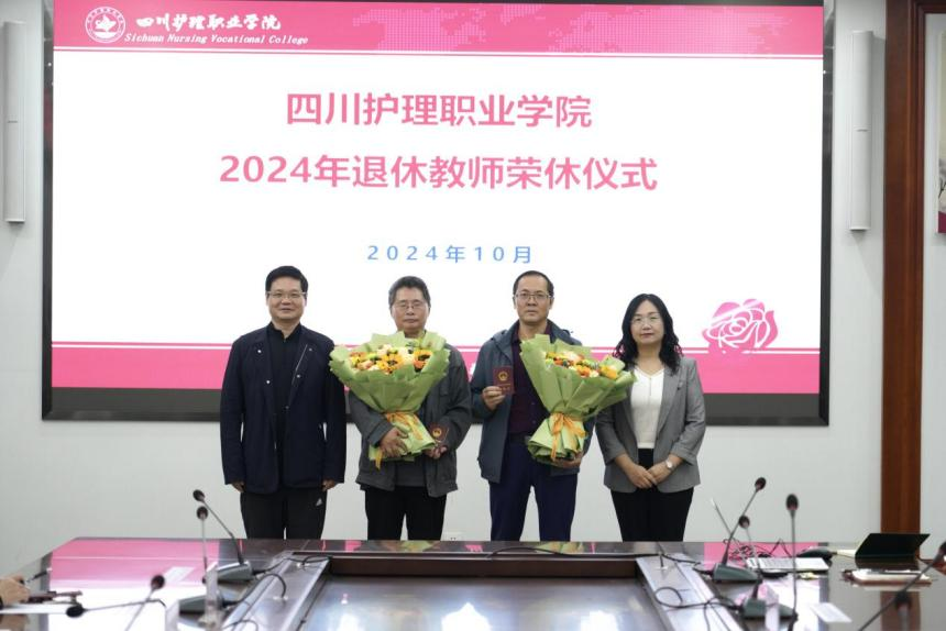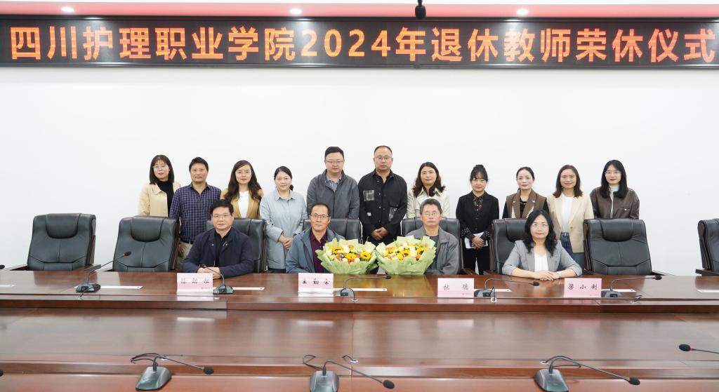 陈劲松代表学院党委感谢光荣退休的两位教师三十年如一日扎根岗位辛勤付出。他表示,两位教师是学院蓬勃发展的见证者、参与者,更是川护“五爱五尽”家校情怀的践行者,正是因为有一代又一代的川护人艰苦奋斗、守正创新,才能推动学院的事业不断发展壮大。最后他对荣休教师的退休生活寄予美好祝愿,并希望他们常回家看看,为学院高质量发展献计献策。