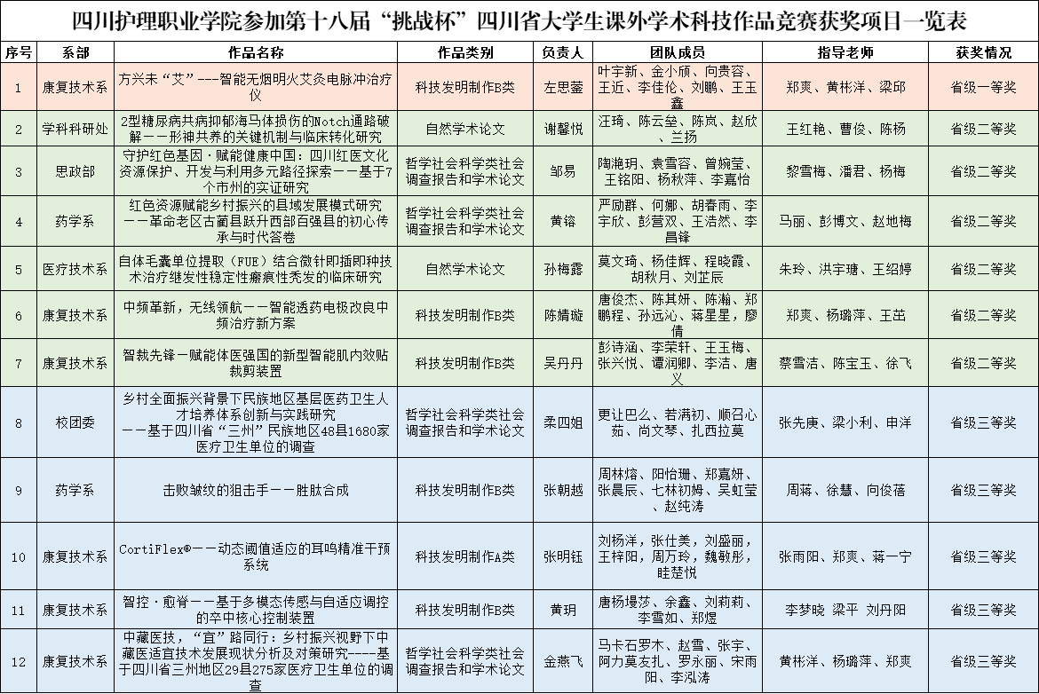 近日,由团省委、省委组织部、省教育厅、省科技厅、省人力资源和社会保障厅、省科协、省社会科学院、省学联、成都市新都区人民政府共同主办的第十八届“挑战杯”四川省大学生课外学术科技作品竞赛终审决赛在成都医学院举办。本项赛事是研究生、本科、专科项目同台评审竞争。经激烈角逐,学院获一等奖1项、二等奖6项、三等奖5项,学院选派的12个参赛项目均获奖,其中7个项目成功晋级终审决赛,创下学院入围本项赛事省赛终审决赛项目数和获奖总数新高。