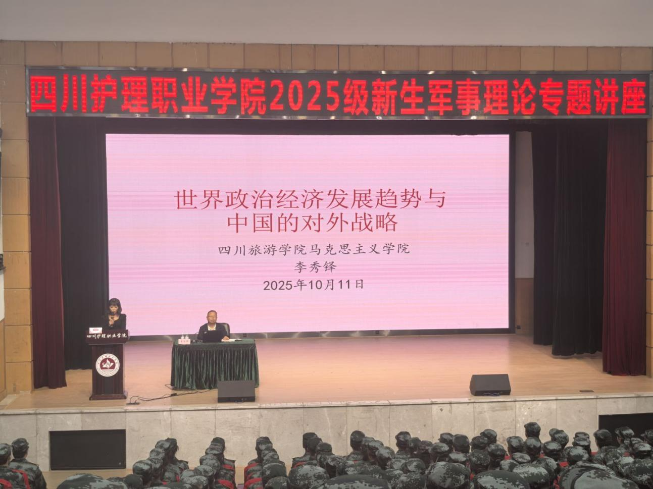 为深入贯彻习近平强军思想,普及军事理论知识,提升广大师生对国际形势的认识与理解,10月11日,学院邀请四川旅游学院马克思主义学院党委副书记、四川省学校国防教育专家库成员、国防时报社特约评论员李秀铎副教授为2025级新生作军事理论专题讲座。马克思主义学院、人民武装部、学生工作部相关人员、各系新生班级辅导员以及2025级全体新生参加讲座,讲座由马克思主义学院院长杨梅主持。
