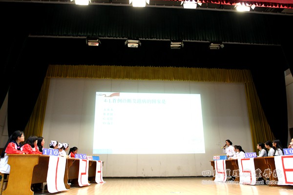 竞赛包括初赛和决赛两大部分。初赛一共49个班级,143名同学参赛。通过理论考试共选拔出6个班级进入决赛,决赛内容包括艾滋病的症状、传播途径、危害、预防、治疗、我国艾滋病的现状以及职业暴露防护等,分为个人必答题、抢答题和风险题三个环节。在必答题环节,6支代表队的选手迅速准确的回答了问题,均拿了满分;抢答题环节把现场的气氛推向了高潮,6组同学激烈地抢答,他们迅速准确的回答赢得了观众的阵阵掌声。为增强参与性,在比赛中还设置了观众互动部分,让同学们的情绪高涨,许多同学获得了小礼品。