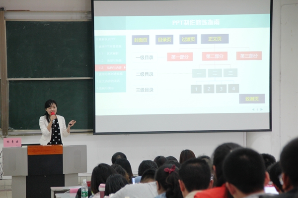 随后,杨青云老师作了题为“PPT制作修炼指南”的专题培训。杨老师以鲜活的实例、精湛的理论知识和丰富的制作经验,从PPT风格设定、布局设置、色彩方案、母版制作、数据图表化等方面系统阐述了制作优秀PPT所需的素材和思维,让老师们对PPT的功能、做法、技巧有了全新的认识。