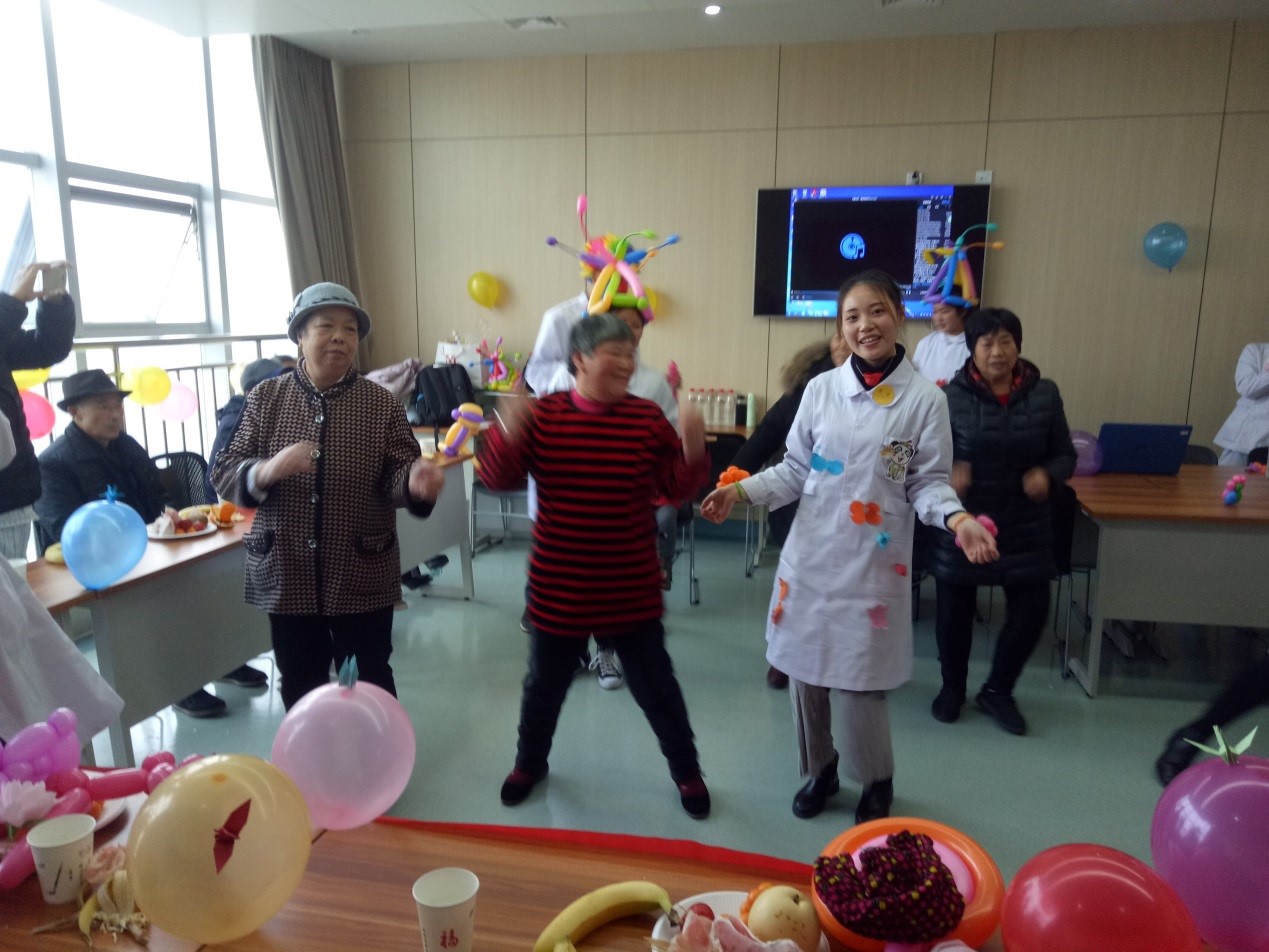 瞧瞧,就连年轻帅气的大哥和护士姐姐也跟着举起手臂、扭起腰来!