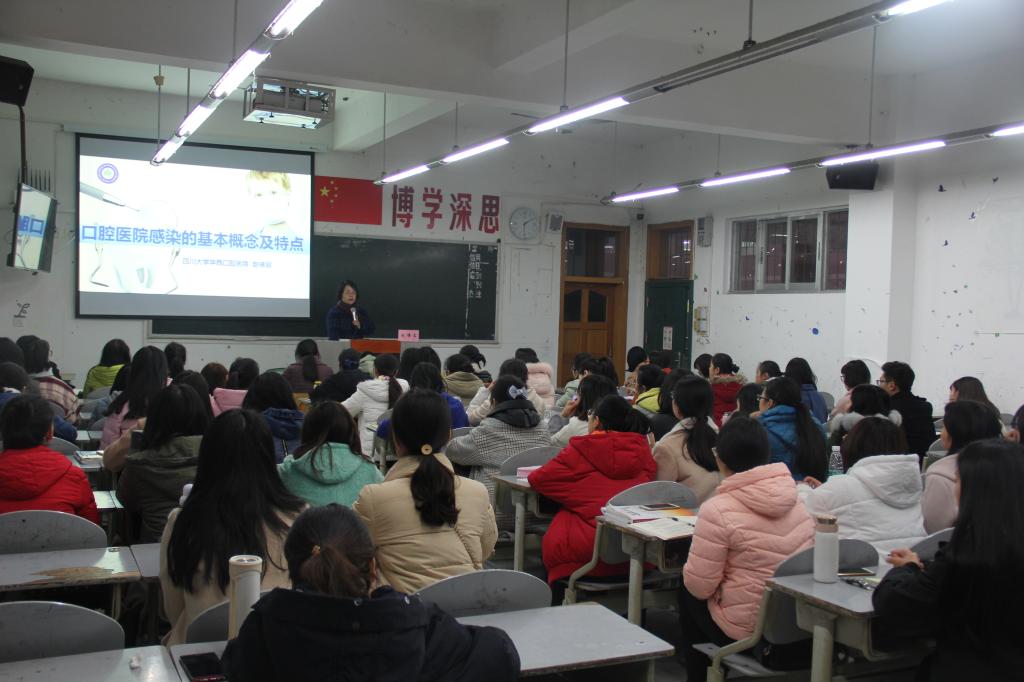 12月21日,四川大学华西口腔医院护理部主任赵佛容教授亲临我院,讲授了一堂精彩生动、切合临床实际的口腔医院感染管理课。她结合临床实践案例,强调了护理人员在预防口腔医院感染中的重要作用,并围绕口腔感染的传播途径、消毒灭菌技术等内容,系统地阐释了口腔医院感染的基本概念与管理模式。试点班学生与助教纷纷表示,此次课程内容丰富充实,赵佛容教授授课生动形象、深入浅出,让人受益匪浅。课后,我院副院长姚永萍表达了对赵佛容教授教学团队的感激之情,并鼓励同学们正学风、求实学,脚踏实地、珍惜机会,以赤子之心投入口腔护理新生力量的队伍中。