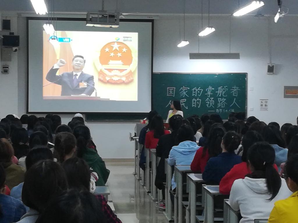 3月17日,十三届全国人大一次会议举行第五次全体会议,选举产生新一届国家机构领导人,中共中央总书记、中央军委主席习近平全票当选中华人民共和国主席、中华人民共和国中央军事委员会主席。3月18日晚,为深入贯彻落实两会精神,及时宣传党的最新政策主张,在以“聚焦两会”为主题的班会上,同学们集体收看了十三届全国人大一次会议选举习近平为中华人民共和国主席、中华人民共和国中央军事委员会主席的相关视频,学习了人民日报社论《国家的掌舵者,人民的领路人》。通过收看和学习,同学们备受鼓舞,深感振奋,纷纷表示, 党的十八大以来,以习近平同志为核心的党中央以巨大的政治勇气和强烈的责任担当,带领全国各族人民,推动党和国家事业发生了历史性变革,成就辉煌,人民群众获得感显著增强。习近平总书记全票当选国家主席、中央军委主席,这是党心、军心、民心所向,也是全党、全军、全国各族人民对以习近平同志为核心的党中央的充分信任和拥护。作为担当民族复兴大任的时代新人,要不忘初心、坚定信念跟党走,要衷心拥护、坚决维护习近平总书记在全党的核心地位。要有“强国一代有我在”的使命与担当,弘扬工匠精神,争做大国工匠,服务健康四川。