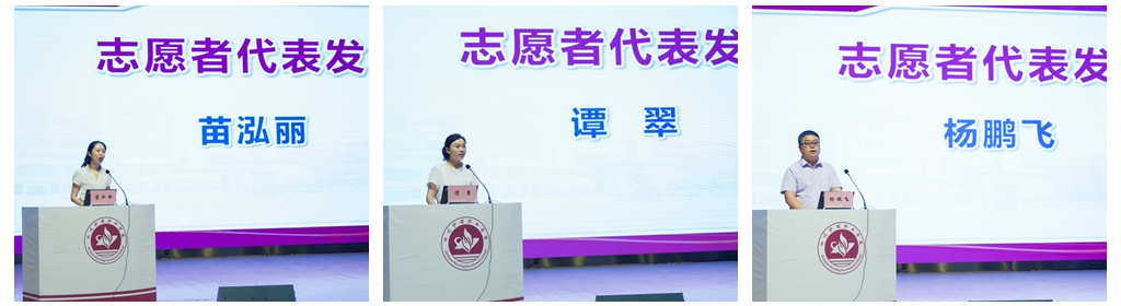 志愿者代表苗泓丽、谭翠、杨鹏飞发言。他们回顾了疫情期间,在队长张先庚教授倡议下,踊跃加入抗击新冠肺炎爱心志愿服务队的心路历程,以及志愿队成员在队长率先垂范,身体力行的榜样下,知苦不言苦,知难不畏难,冲锋陷阵,勇于担当的工作状态,向大家展现了爱心志愿服务队成员在疫情防控阻击战中的决心和信心。