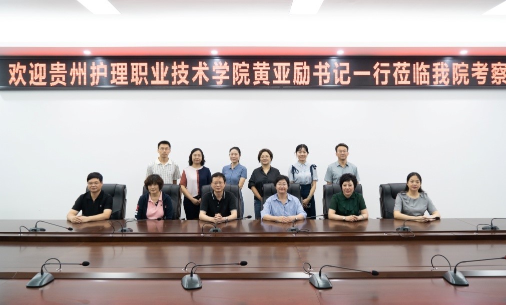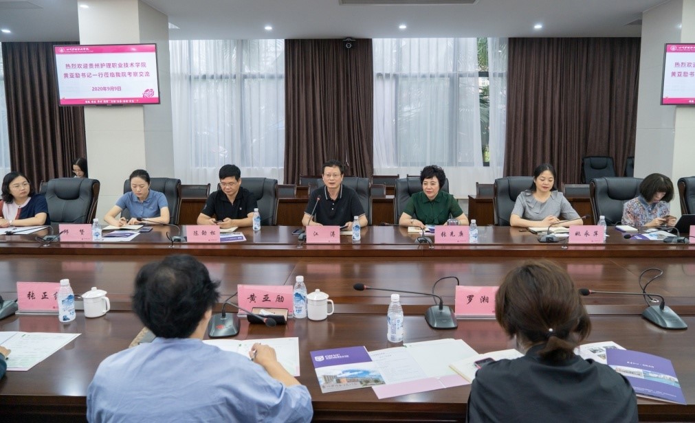 2020年9月9日,贵州护理职业技术学院党委书记黄亚励一行4人到我院考察交流。学院党委书记江涛、院长张先庚,副院长陈劲松、姚永萍及相关部门负责人陪同参加了考察交流活动。