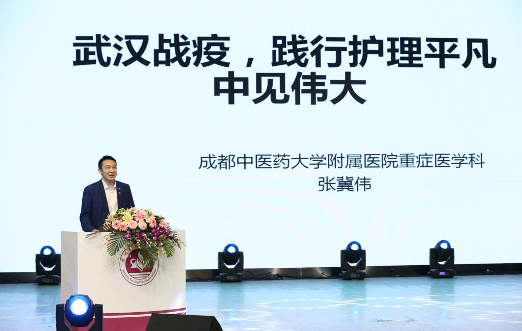 在第二篇章“爱的守护——天使逆行,战疫先锋”中,“青羊区吴彦祖”张冀伟作为驰援武汉的90后男护士,分享了他前往武汉抗疫的所见所感,以及他对护理事业的理解。他鼓励学弟学妹们努力学好护理知识与本领,树理想、有担当,用行动践行初心使命,用自己过硬的专业知识和技术冲锋在前、救死扶伤、倾情奉献。