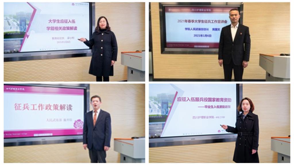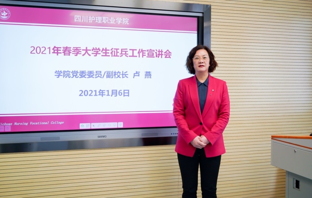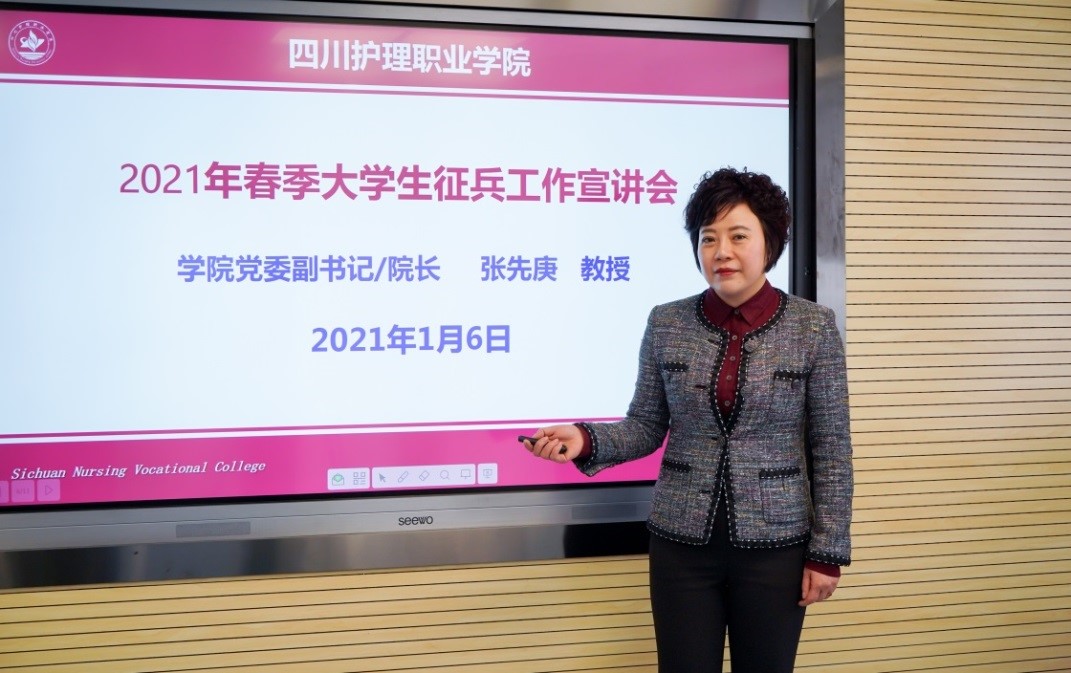 1月6日下午,学院院长张先庚教授带领人民武装部、教务处、学生工作部、招生就业处负责人为学院三年级学生(正在临床实习)开展了一堂以“踊跃报名参军、实现强军报国梦”为主题的大学生征兵工作宣讲会,希望广大川护优秀学子踊跃参军,实现强军报国梦。宣讲会由学院党委委员、学校副校长卢燕主持。