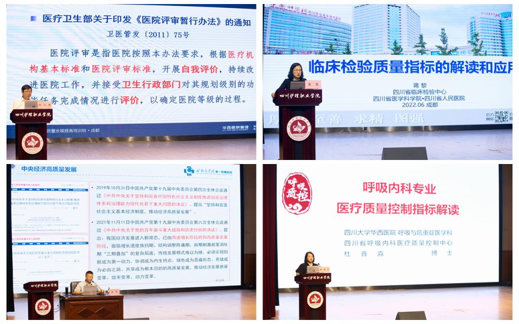 医院评审是我国一项政策性很强的管理工作,是政府实施行业监管、完善和落实医院管理制度、推动医院不断加强内涵建设、促进医院高质量发展的重要抓手,是医院高质量发展与建设的指挥棒和风向标。我院以结合市场需求和服务社会为目的,自2021年举办医院高质量发展培训以来,得到川内广大医院的认可。本次培训邀请了参与国家及我省医院评审标准实施细则制定工作、具有多年医院评审经验的资深专家,专家们聚焦医院评审相关政策及评审标准内涵,通过理论讲授和现场答疑等形式进行专业解读,同时对院感、检验、呼吸、麻醉、护理等重点专业质控指标数据报送、参考值情况等进行了分析点评。