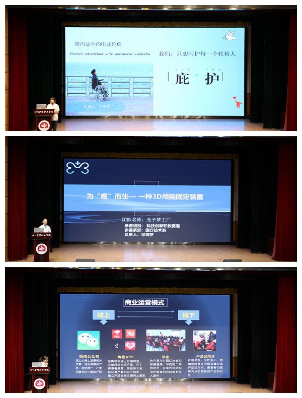 活动首先由获得职教赛道一等奖的项目负责人,分别对《带自动伞的电动轮椅》《中老年保健鞋垫》《为“癌”而生—一种3D颅脑固定装置》3个优秀创新项目进行现场展示。