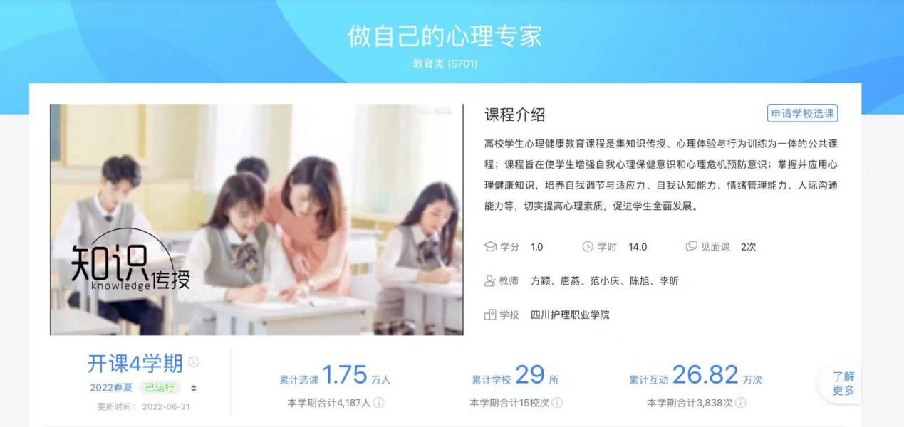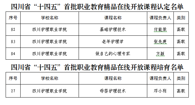 近日,四川省教育厅发布了《关于公布“十四五”首批职业教育精品在线开放课程认定结果的通知》(川教函〔2022〕251号)文件,我院《基础护理技术》《老年护理学》《做自己的心理专家》3门课程被认定为四川省“十四五”首批职业教育精品在线开放课程,《母婴护理技术》被认定为培育课程,4门在线开放课程的认定充分展现了学院课程建设、专业建设的优秀成果。