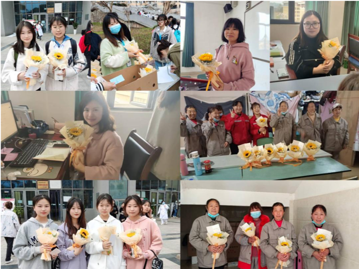 3月7日,在国际劳动妇女节即将到来之际,为引导广大学生感受爱、发现爱,学会爱。中心组织心理研习社、心灵驿站社、青年志愿者协会等部门的同学为学院女教师、食堂阿姨、宿管阿姨、女同学送上太阳花花束,表达节日最真挚的祝福。