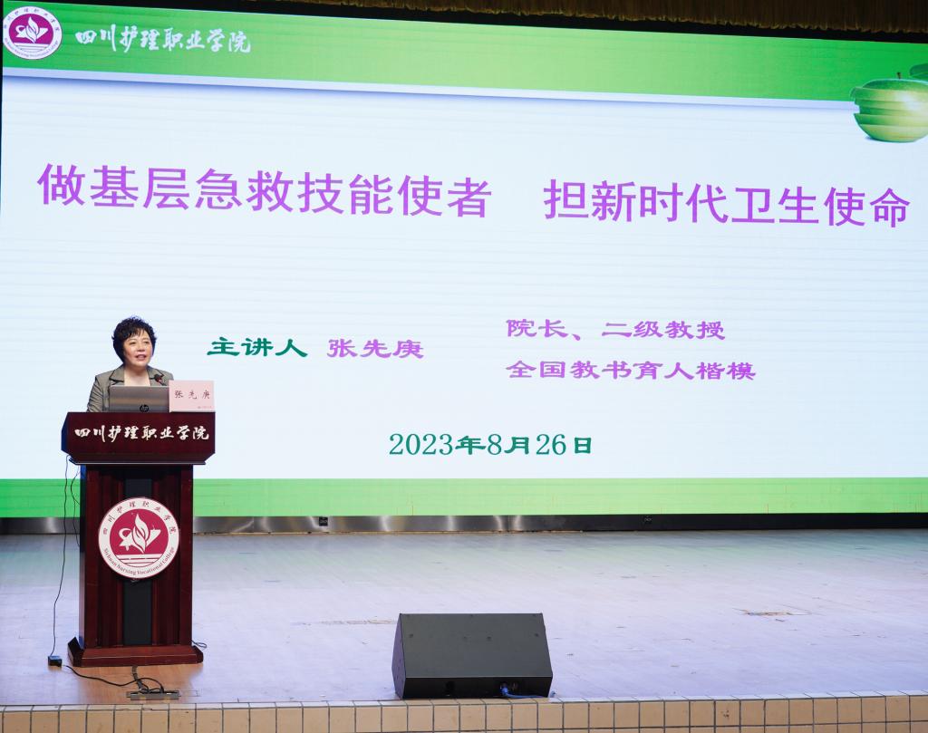 张先庚对来自基层医疗机构的56名学员表示欢迎,简要阐释了本次培训的背景意义和卫生行业与学校发展情况。她强调,一要感恩党和政府的厚爱,学好急救知识与技能,用实际行动感党恩、跟党走,为老百姓做好卫生健康服务。二要尽快转变角色,从医务人员转变为学生,严格遵守培训纪律要求,以空杯心态安心、静心努力学习。三是学以致用,学用结合,争做大爱无疆的基层卫生健康守护神。