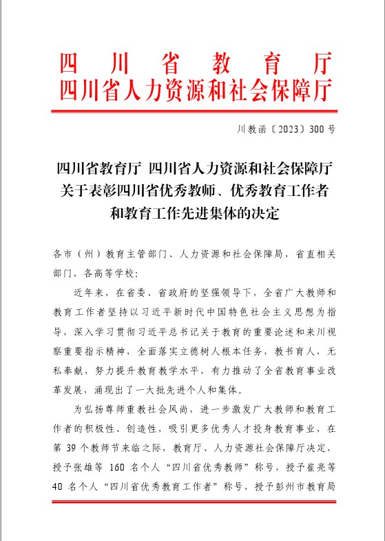 被评为四川省优秀教育工作者