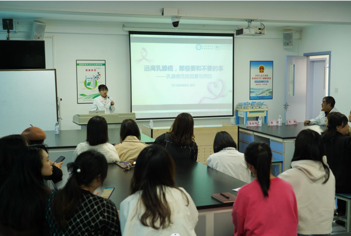 为关心关爱学院女职工身心健康,增强防病治病的科学知识。10月24日,学院工会、妇委会联合四川省抗癌协会、四川省肿瘤医院在成都校区开展“珍爱生命 乳此美丽”2023粉红丝带月科普系列特别活动。省抗癌协会秘书长张文彬、学院工会主席曾孝鹏、省肿瘤医院乳腺专家团队出席活动,学院女职工60余人参加活动。