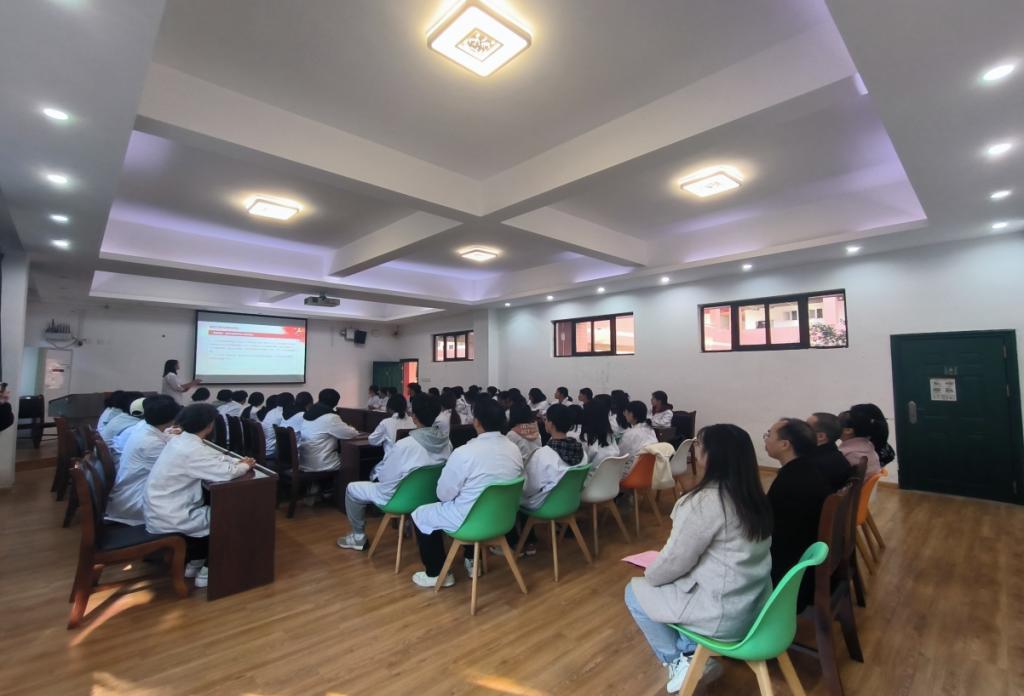 为面向全院广大团员和青年开展学习贯彻习近平新时代中国特色社会主义思想主题教育,帮助同学们坚定理想信念,增强责任担当,12月14日,医疗技术系2023级医学检验技术4班团支部在成都校区召开“挺膺担当砺青春 奋楫扬帆启新程”主题团日活动,活动分为三个环节。省直机关团工委副书记陈木之到校指导,学院学生工作部(团委)、系团委相关人员、辅导员及学生共计60余人参加活动,活动由班级团支部书记任思宇主持。